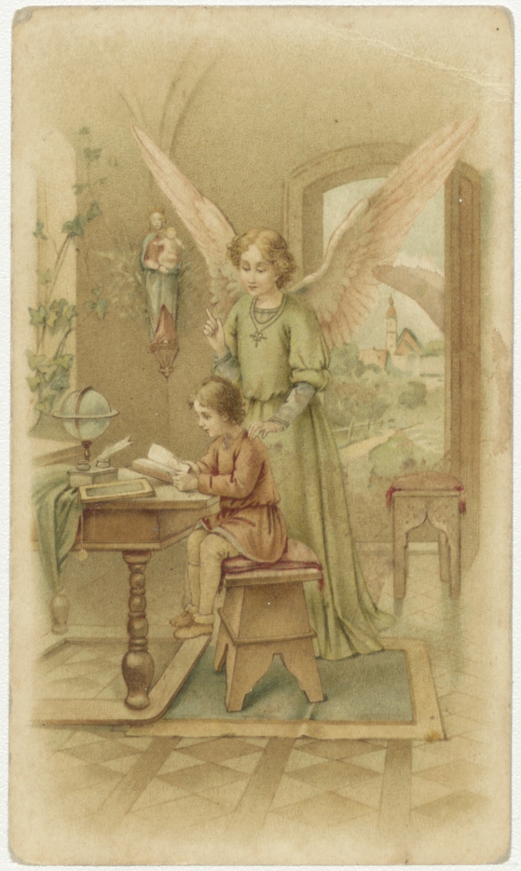 H. Jozef met kindje Jezus, waarboven twee blauwe blo...