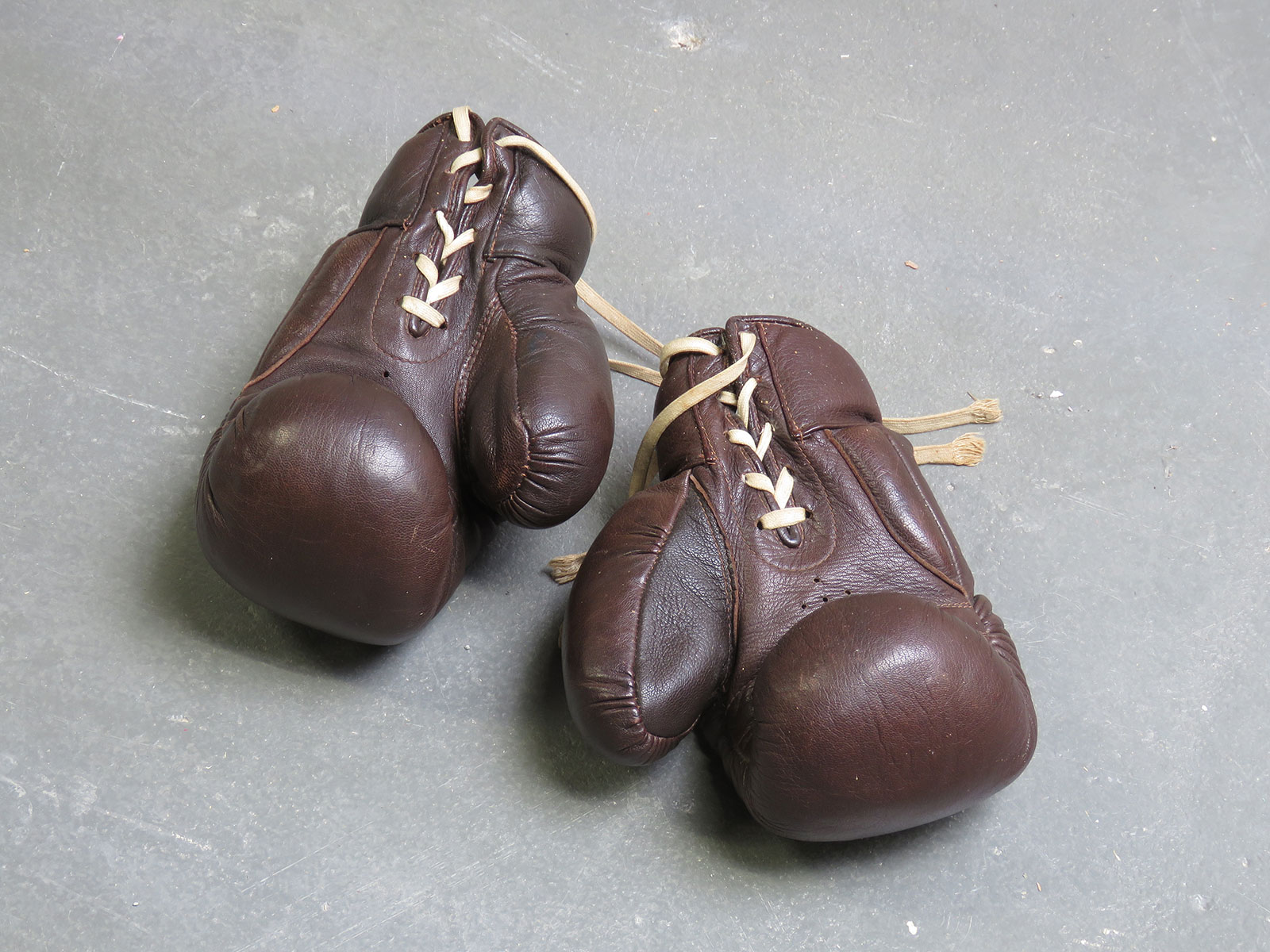 Een paar bruine bokshandschoenen van de kunstenaar A...