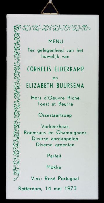 Gelegenheidstegel, waarop in groen op wit het menu t...