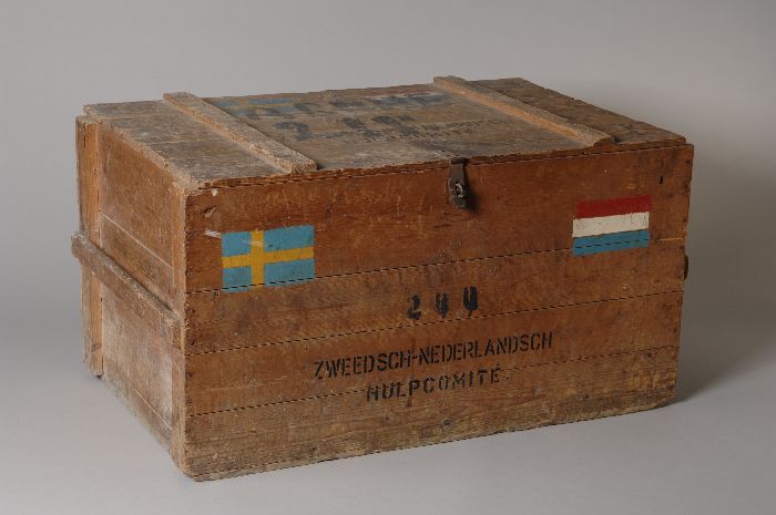 Transportkist met Zweedse en Nederlandse vlag, "200 ...