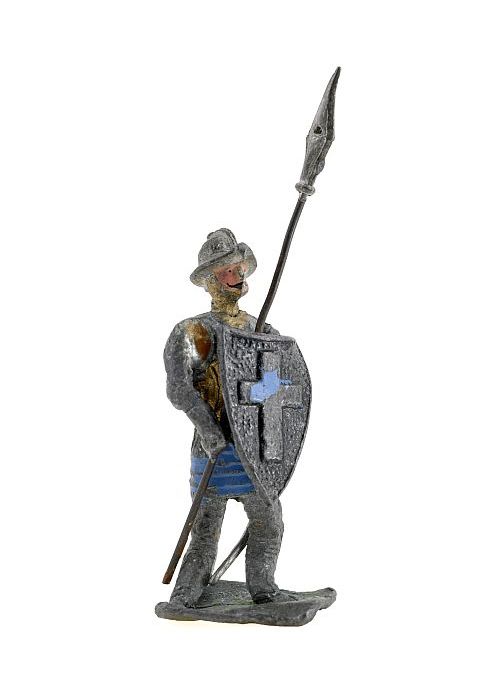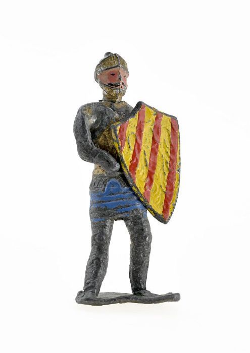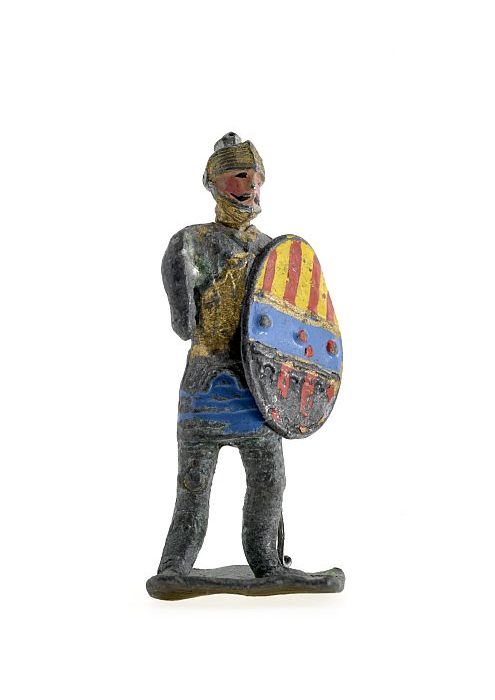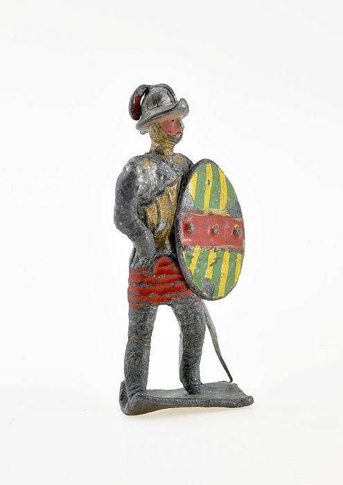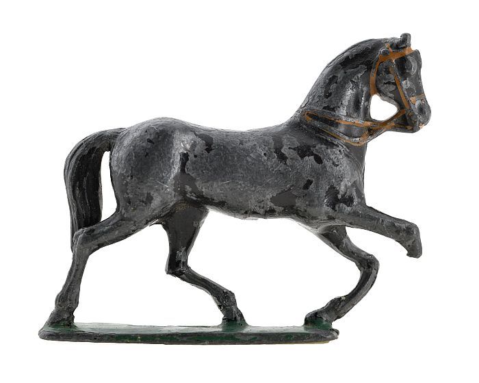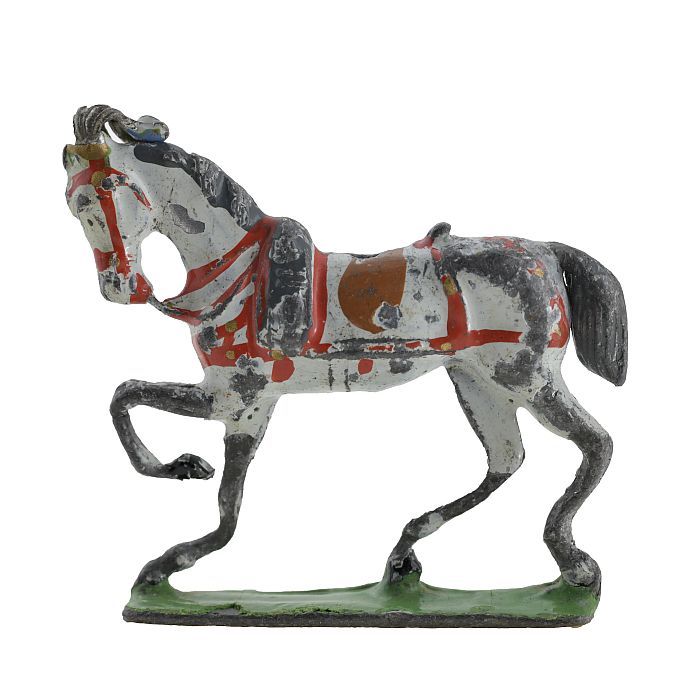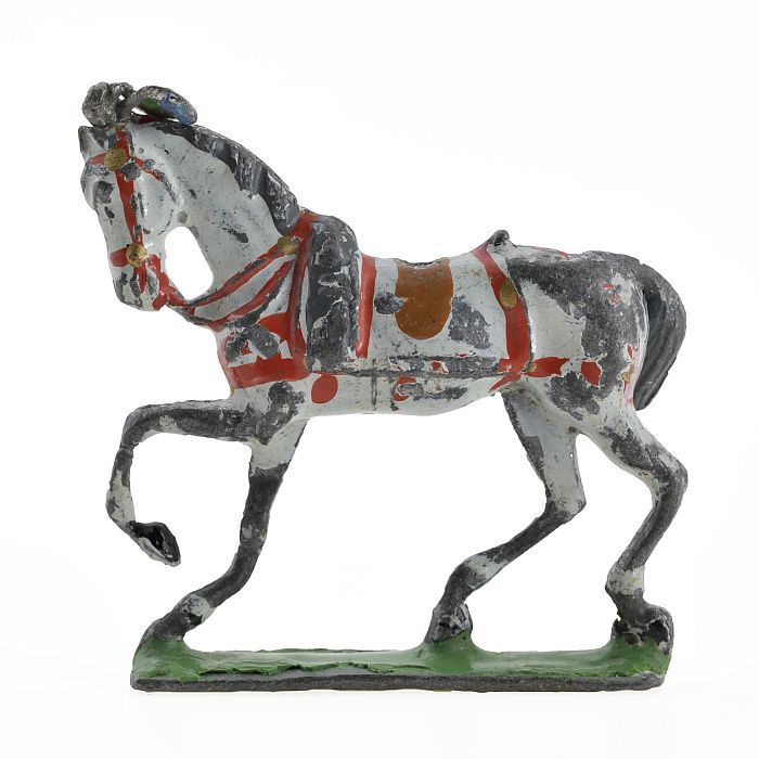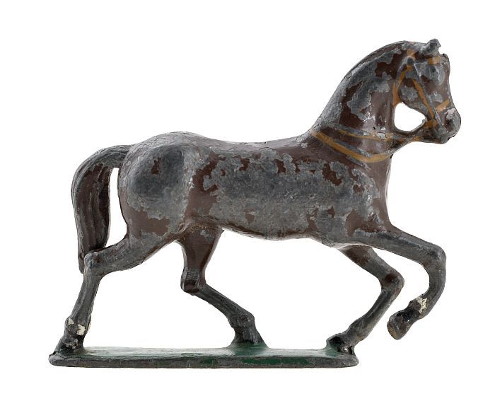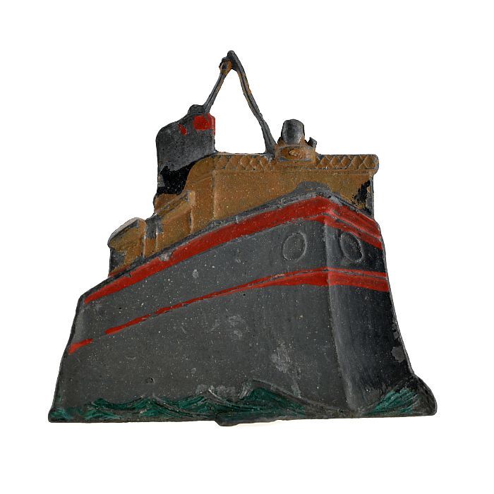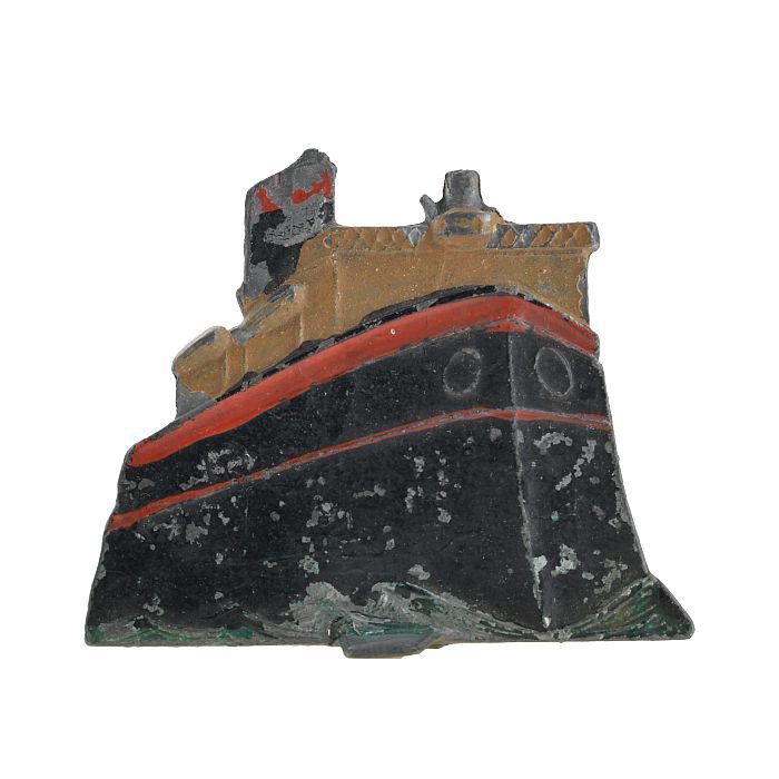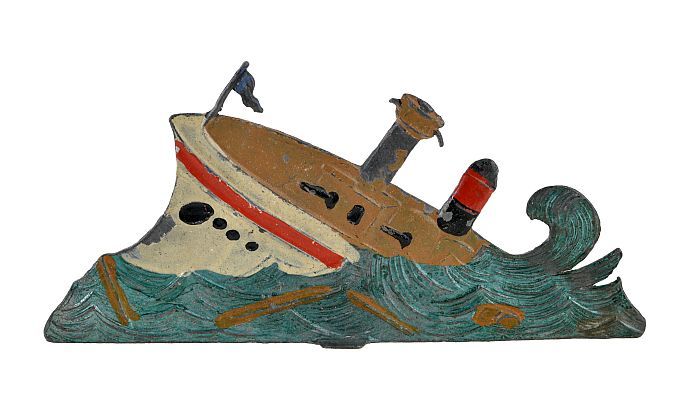 Platte, zinkende, tinnen speelgoedboot op klein voet...