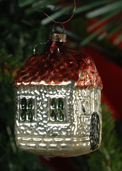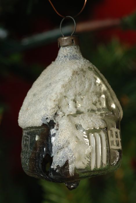 Glazen kerstbal in de vorm van een huis, groene rame...