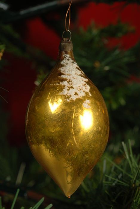 Glazen kerstbal in de vorm van een druppel, goudkleurig