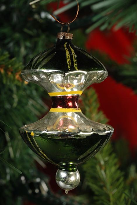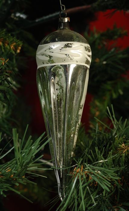 Glazen kerstbal in de vorm van een lange kegel met g...