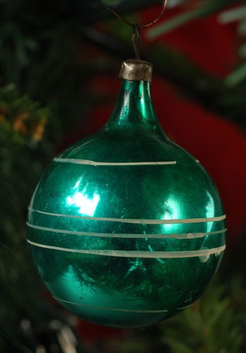 Glazen kerstbal, kogelrond, slanke hals, donkergroen...