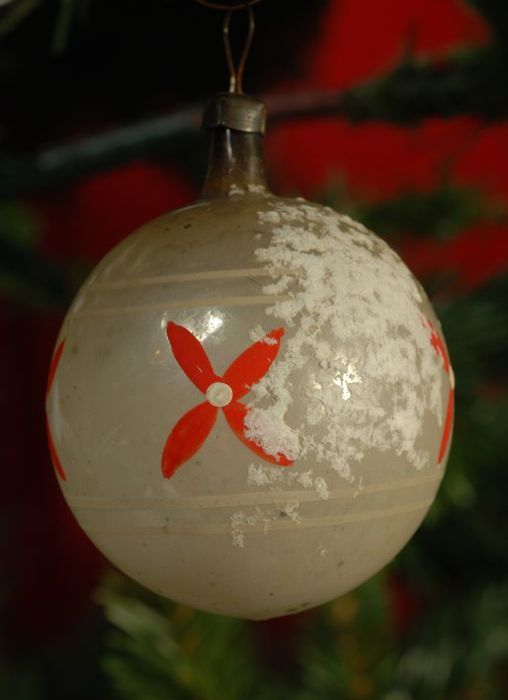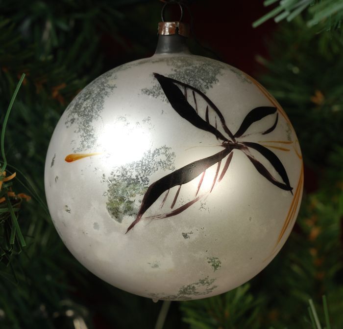 Glazen kerstbal, kogelrond, versierd met steeds vier...