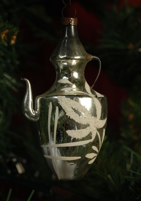 Glazen kerstbal in de vorm van een hoge koffiekan, z...