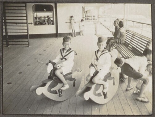 De broers Henk en Hans Japing op hobbelpaarden aan b...