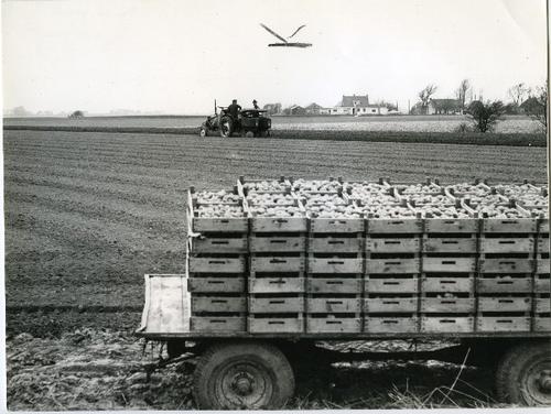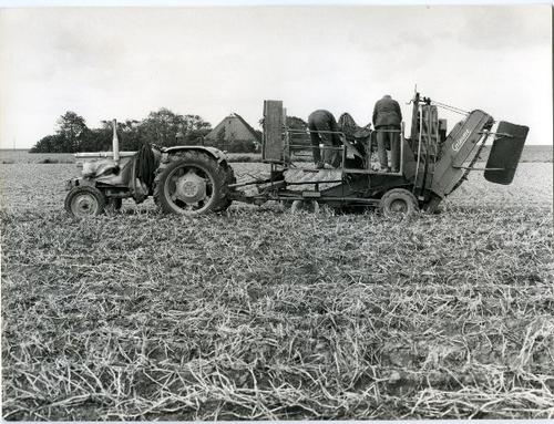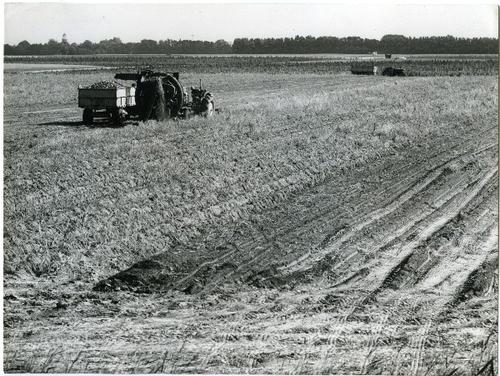 Foto in zwart-wit van het machinaal rooien van aarda...