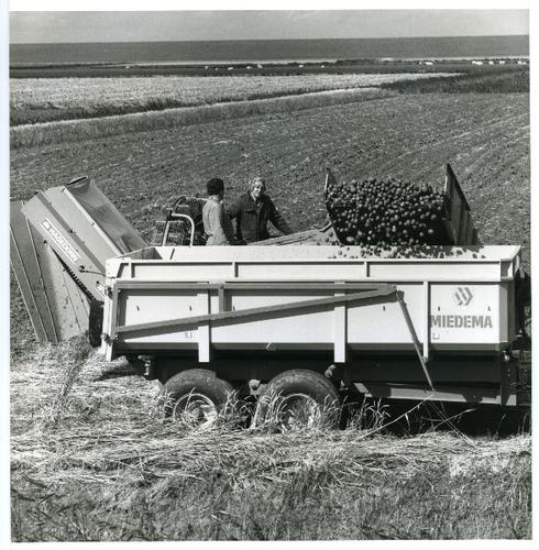 Foto in zwart-wit van een aardappelrooimachine merk ...