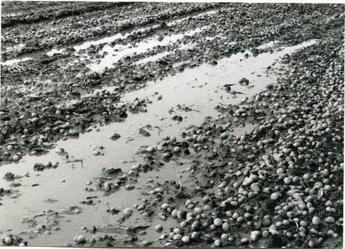 Foto in zwart-wit van een nat veld gerooide aardappe...