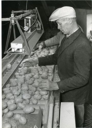 Foto in zwart-wit van een aardappelsorteermachine do...