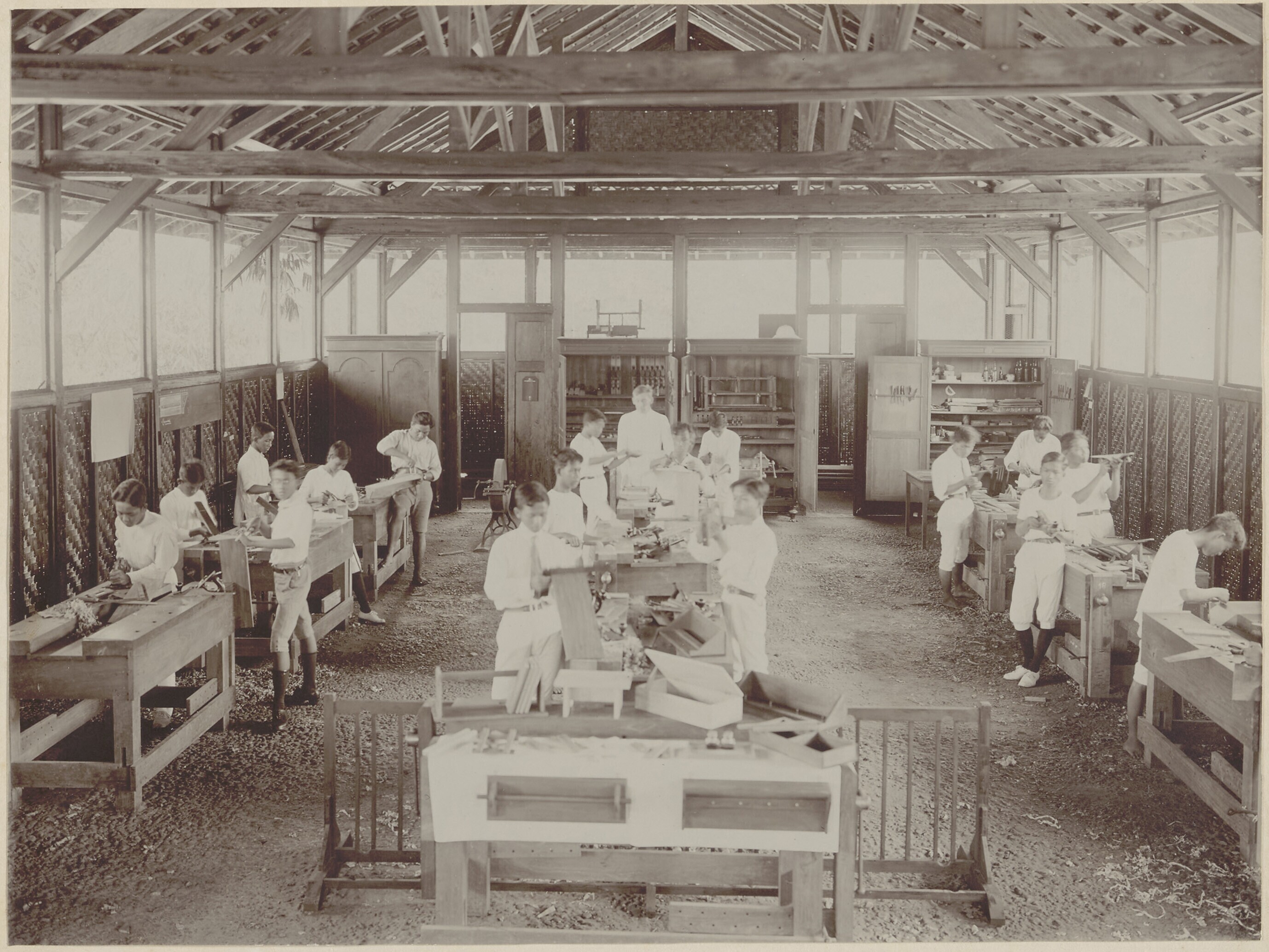 Leerlingen in de timmerloods van de Landbouwschool t...