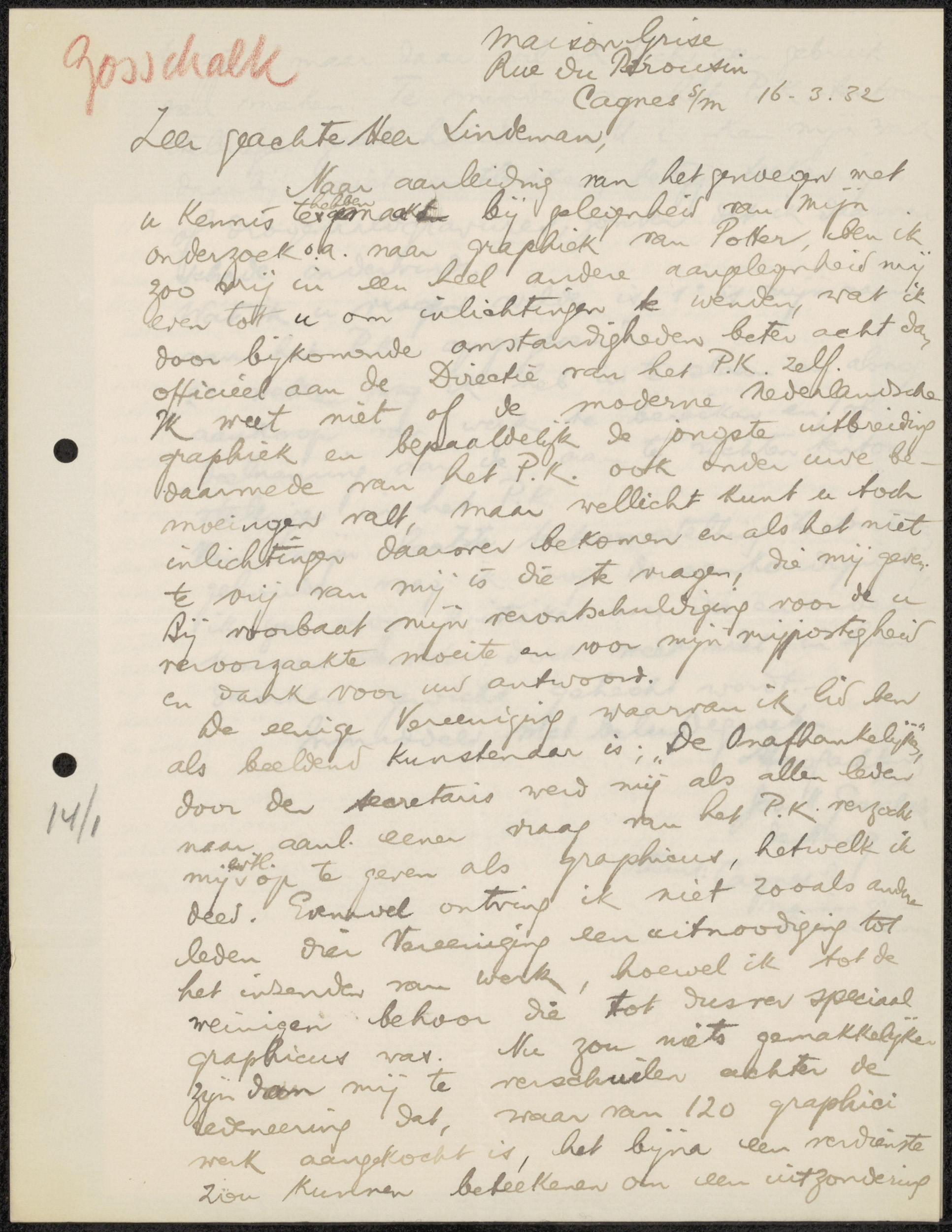 Brief aan C.M.A.A. Lindeman