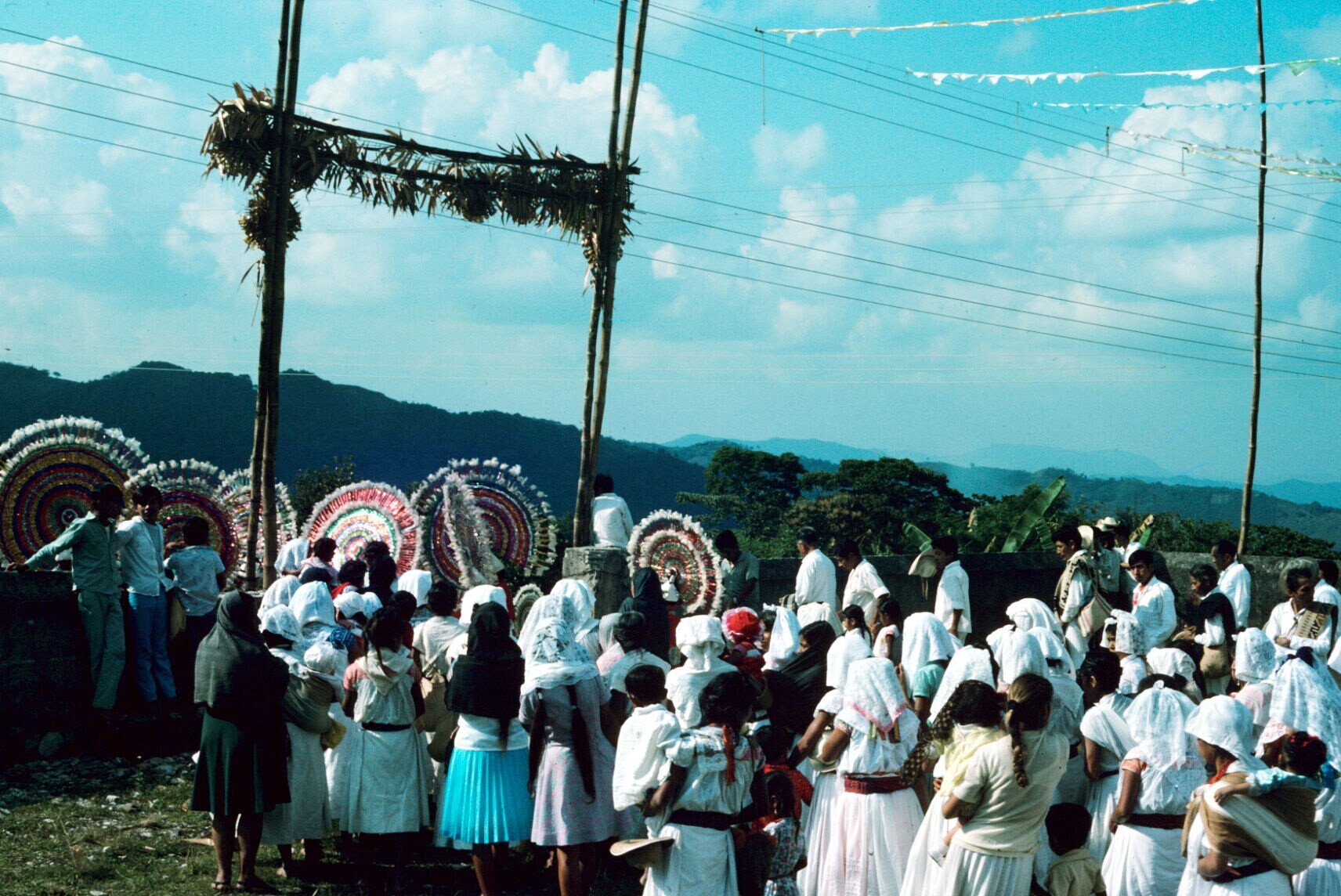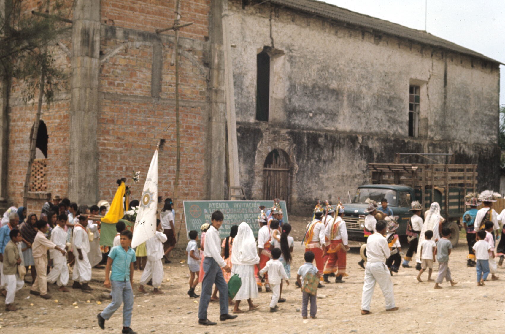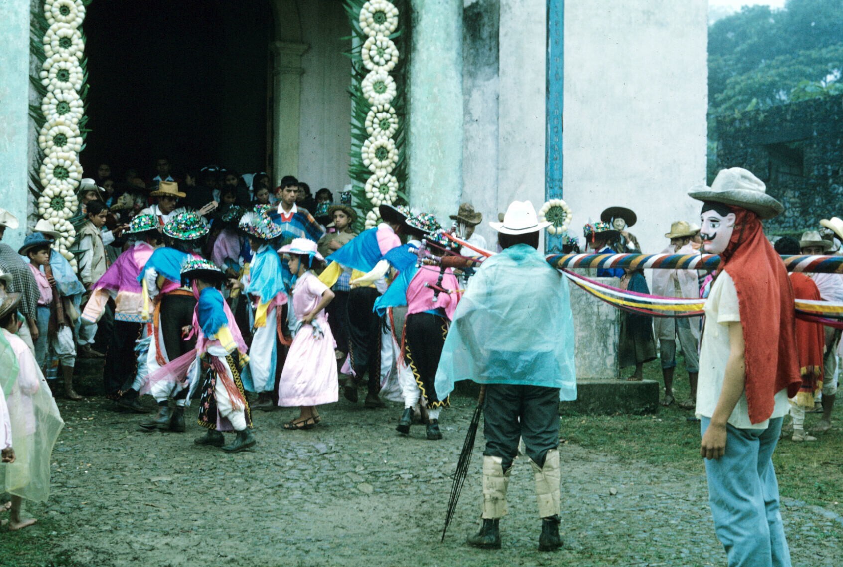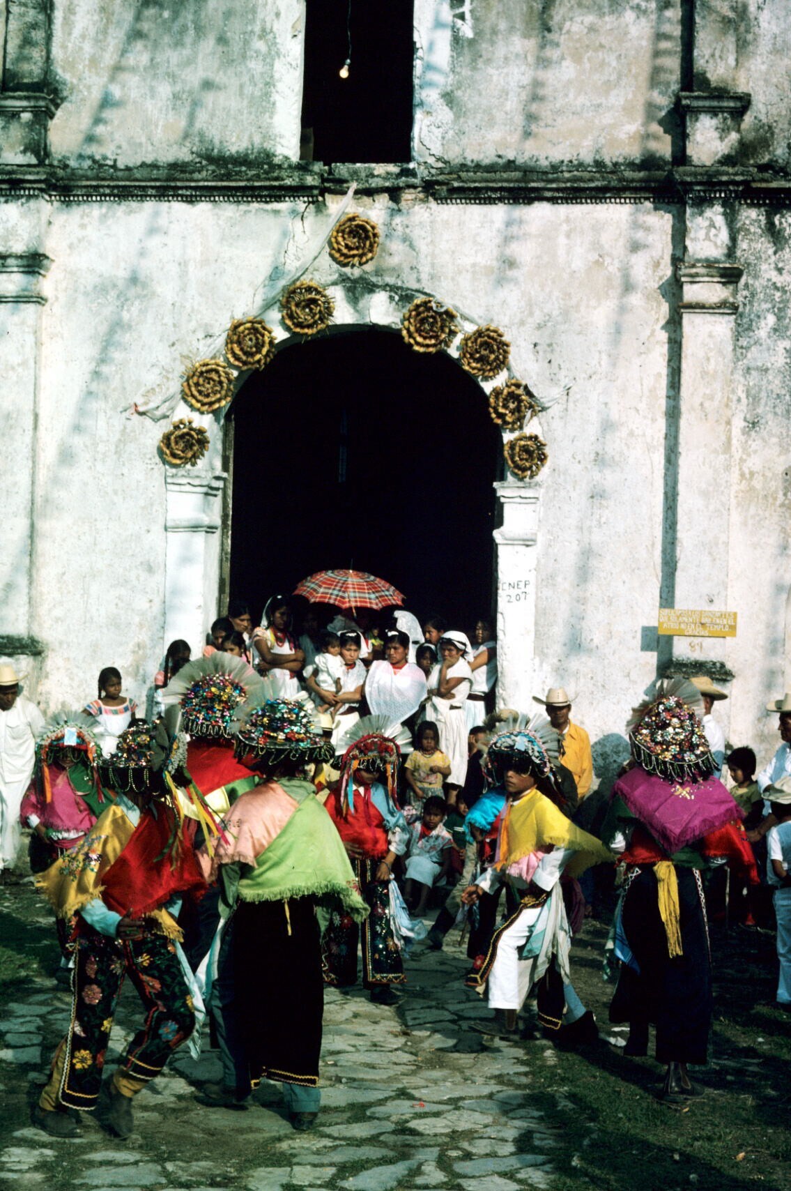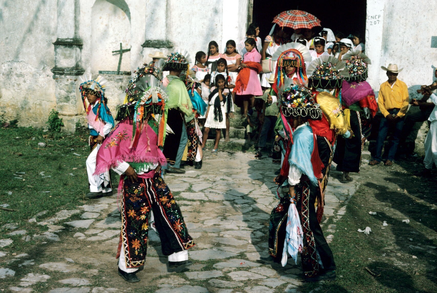 Quetzaldansers en publiek bij kerk