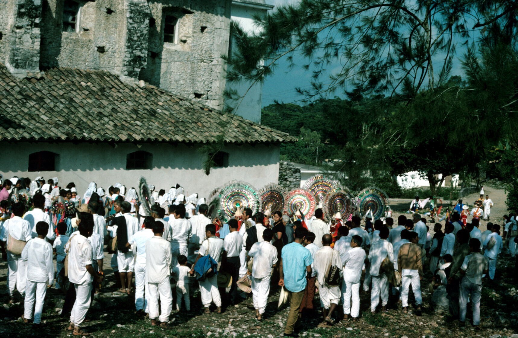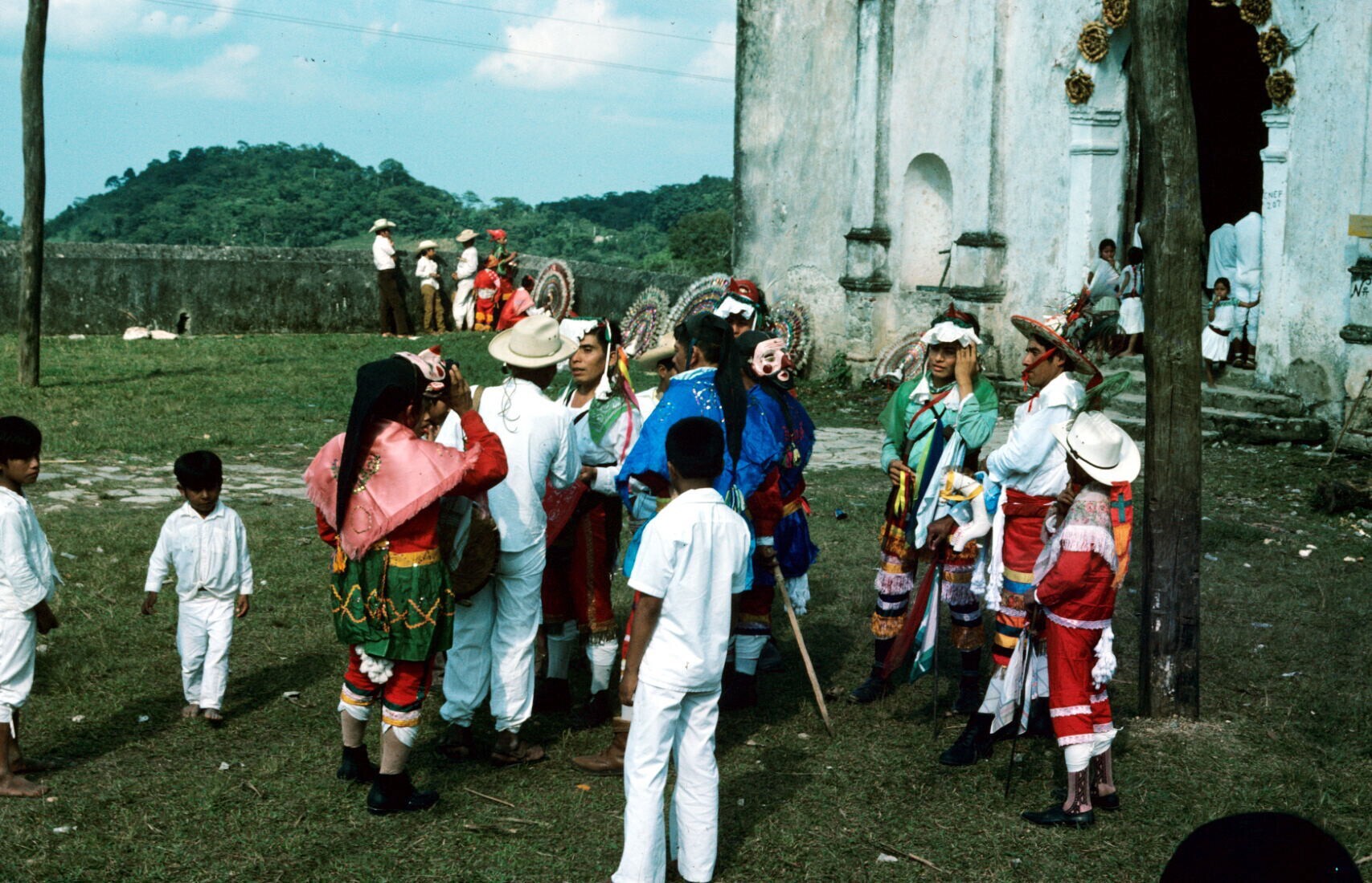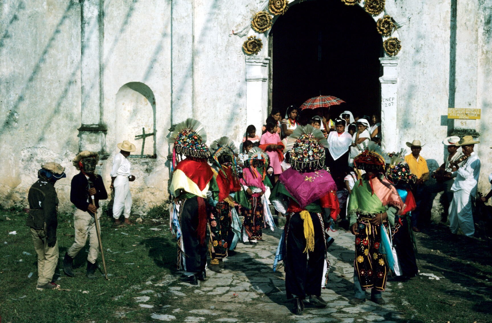 Negritos en publiek bij ingang kerk