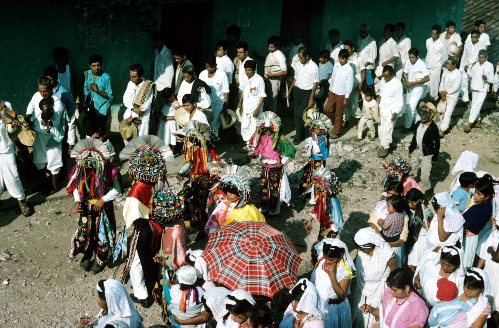 Santiagueros en Quetzaldansers voor de kerk