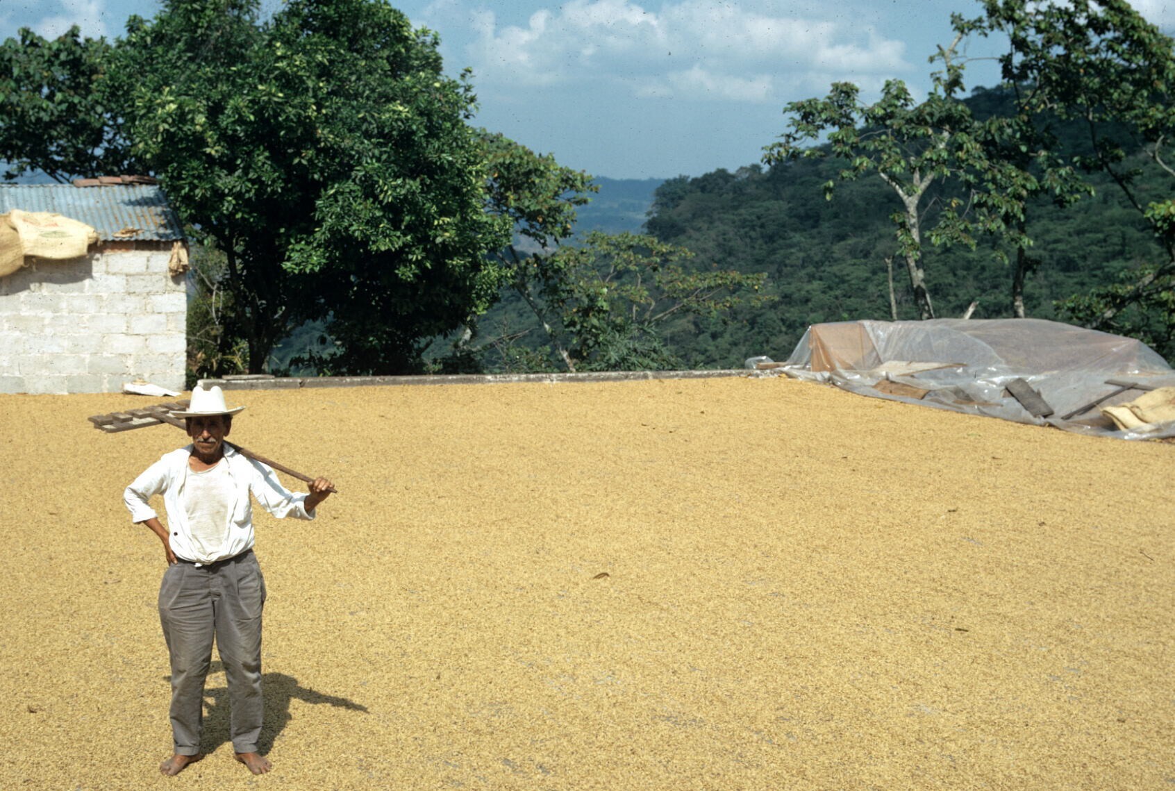man,met gereedschap op schouder, op koffiebonendroog...