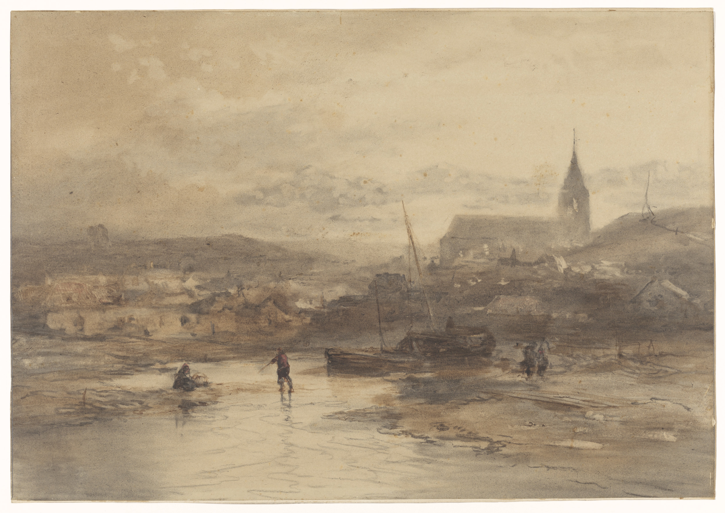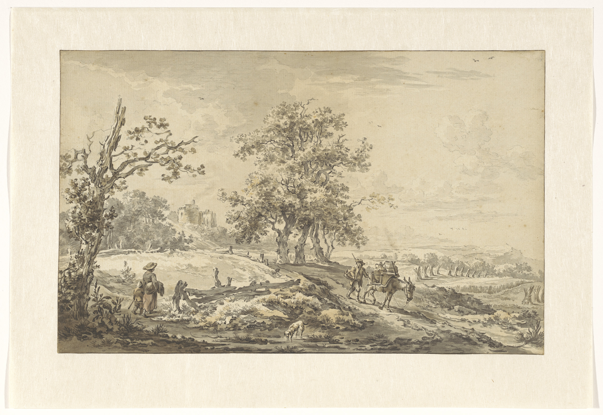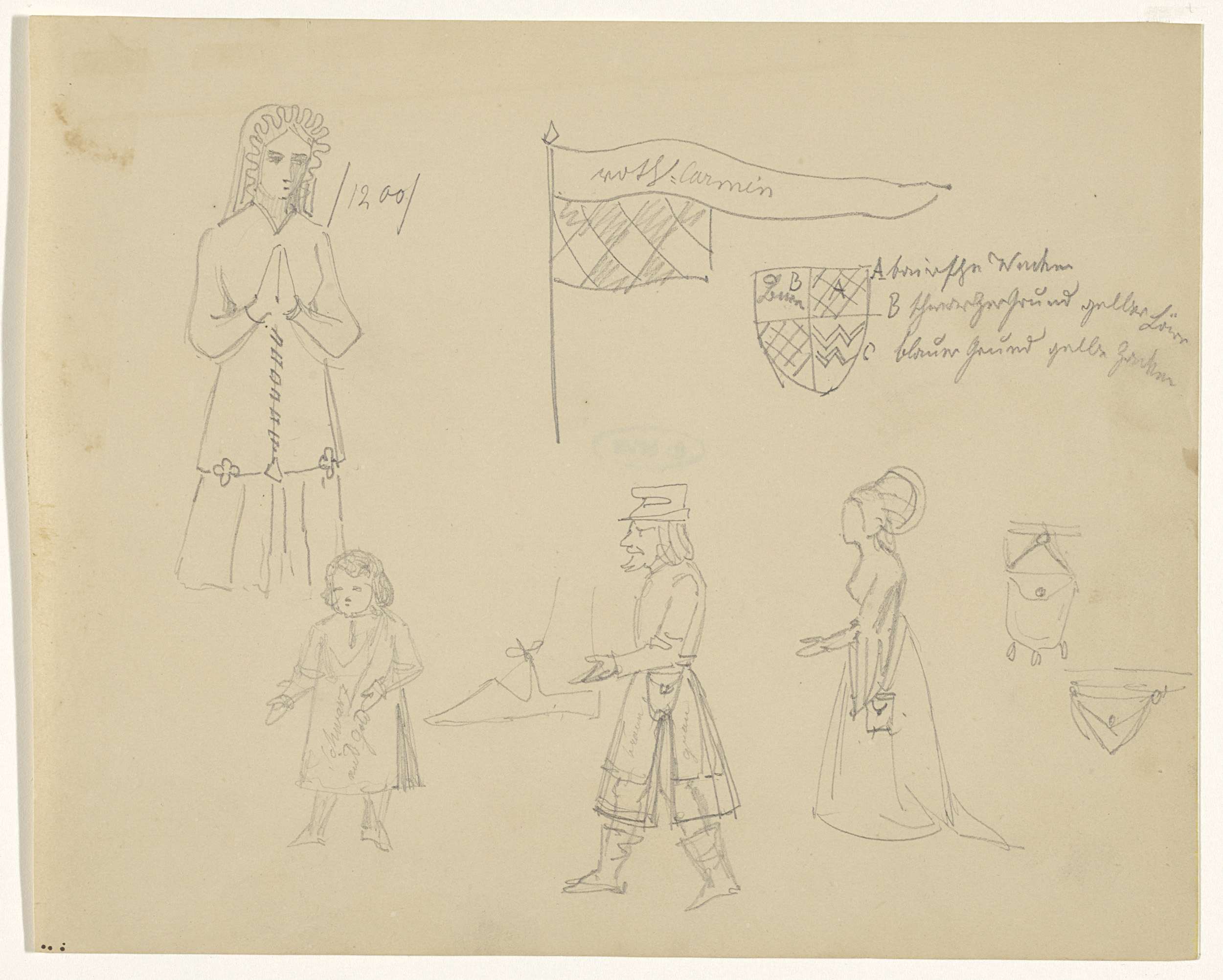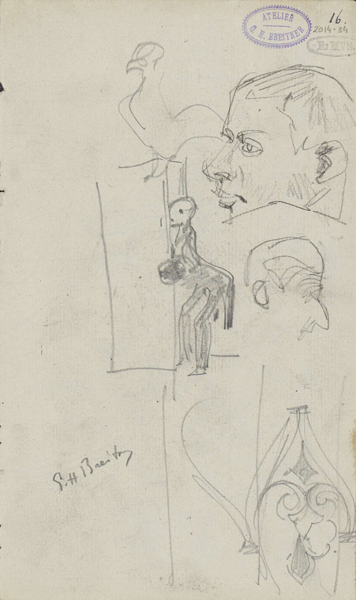 Studieblad met figuren, een vogel en een ornament