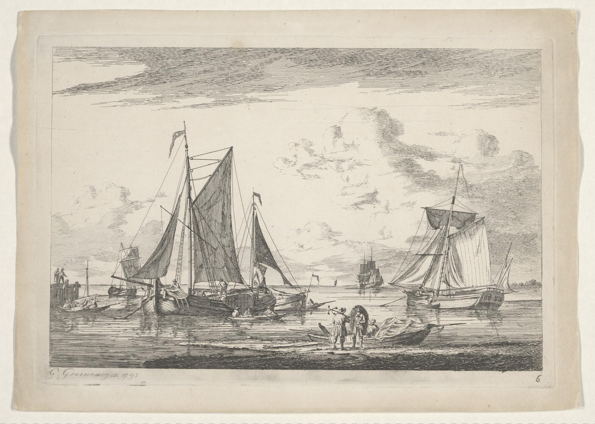 Schepen ten anker bij laag water, links een Zeeuwse ...