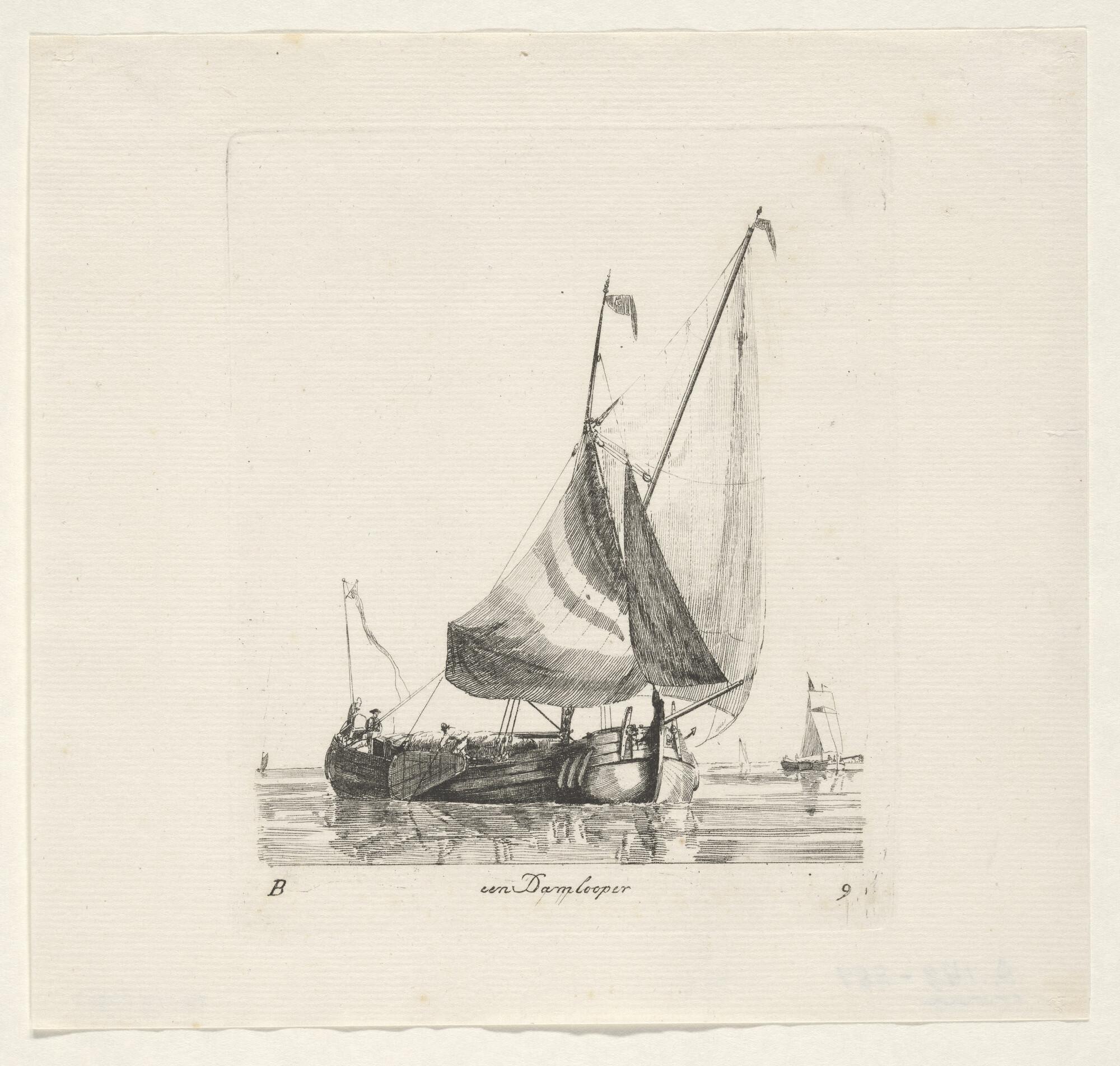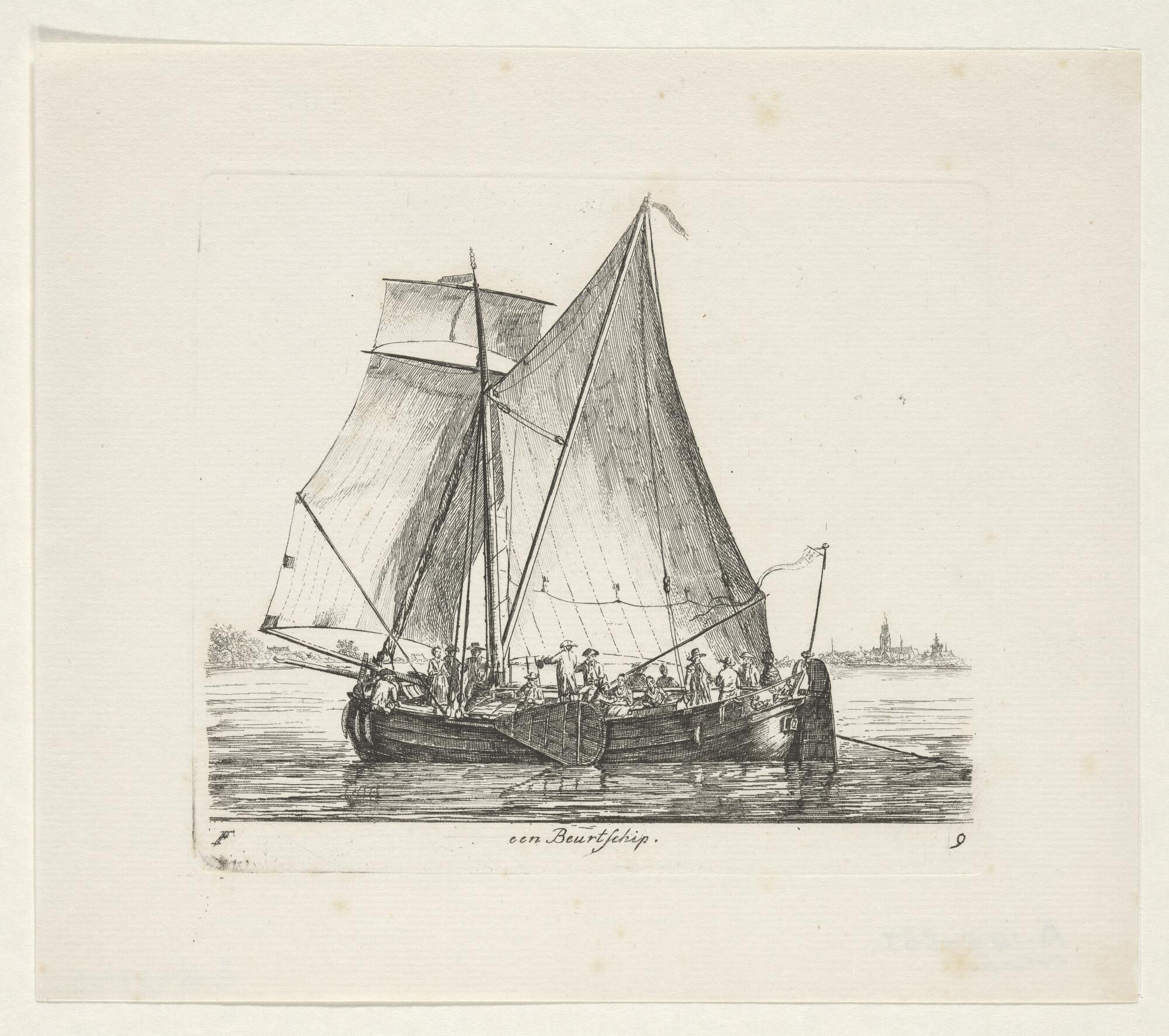 Prent van een beurtschip met passagiers