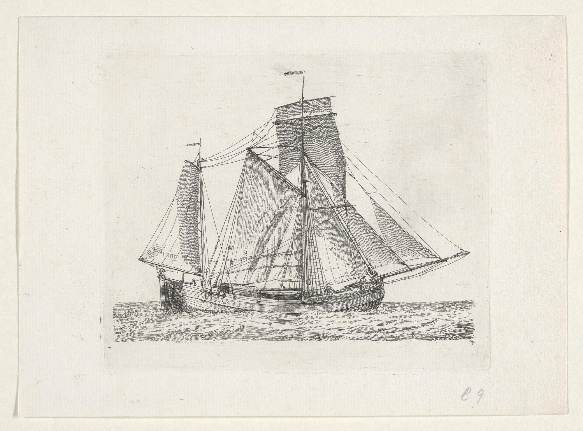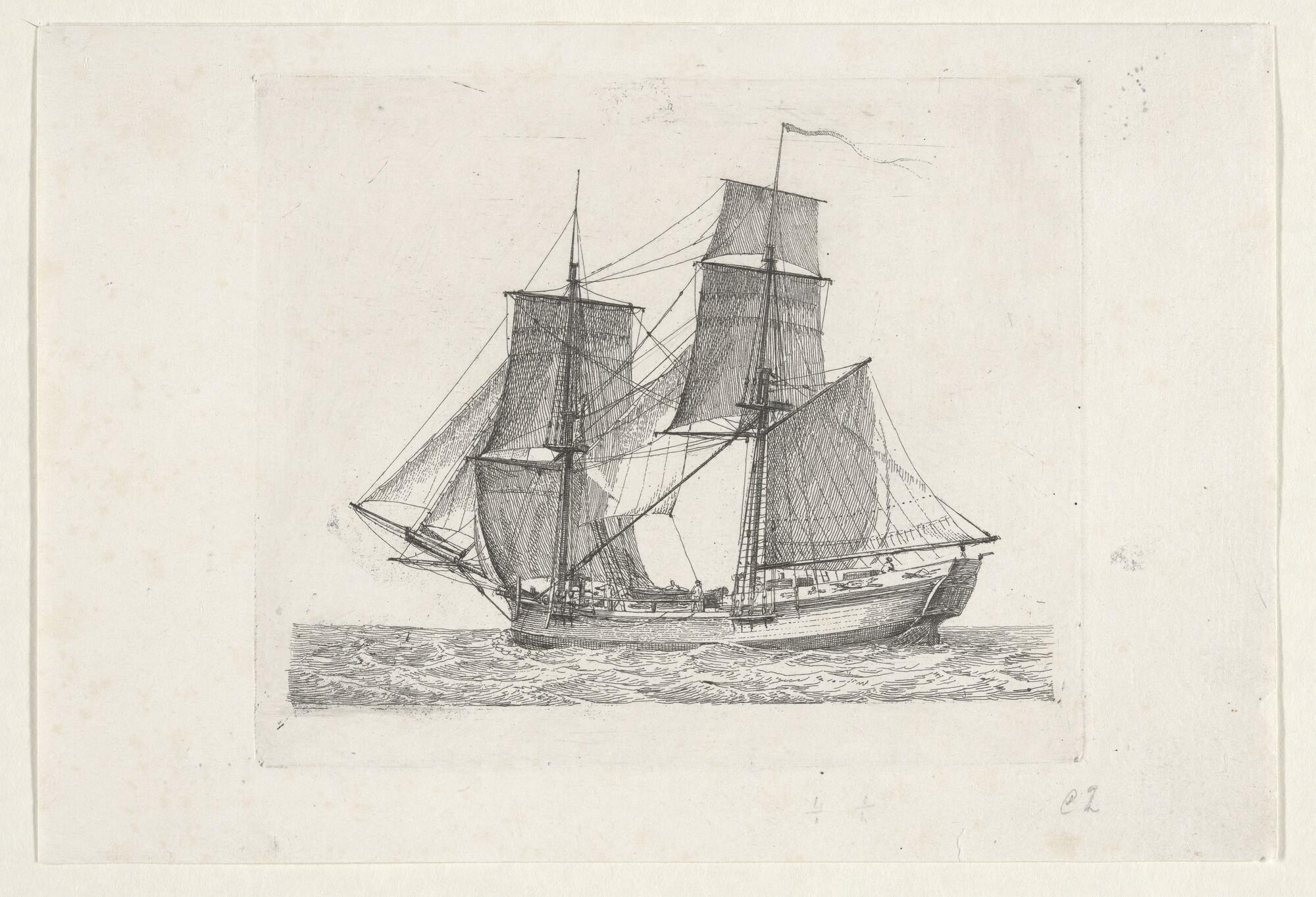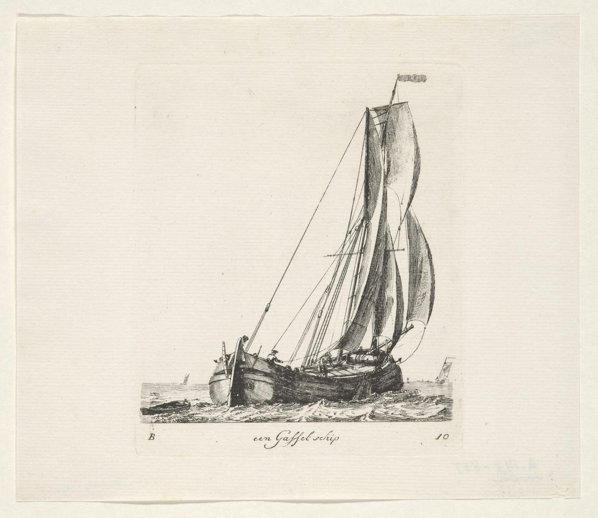 Prent van een gaffelschip