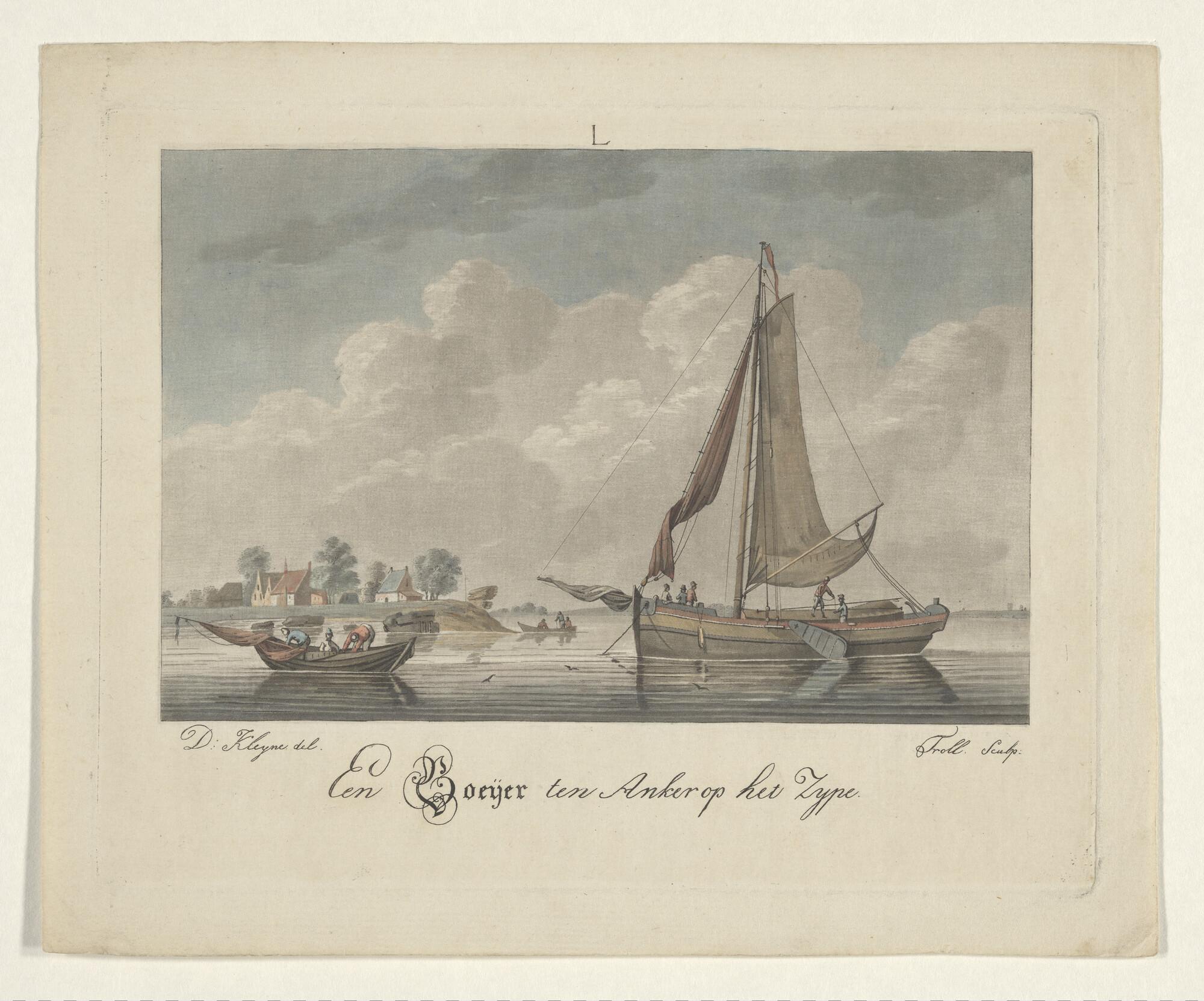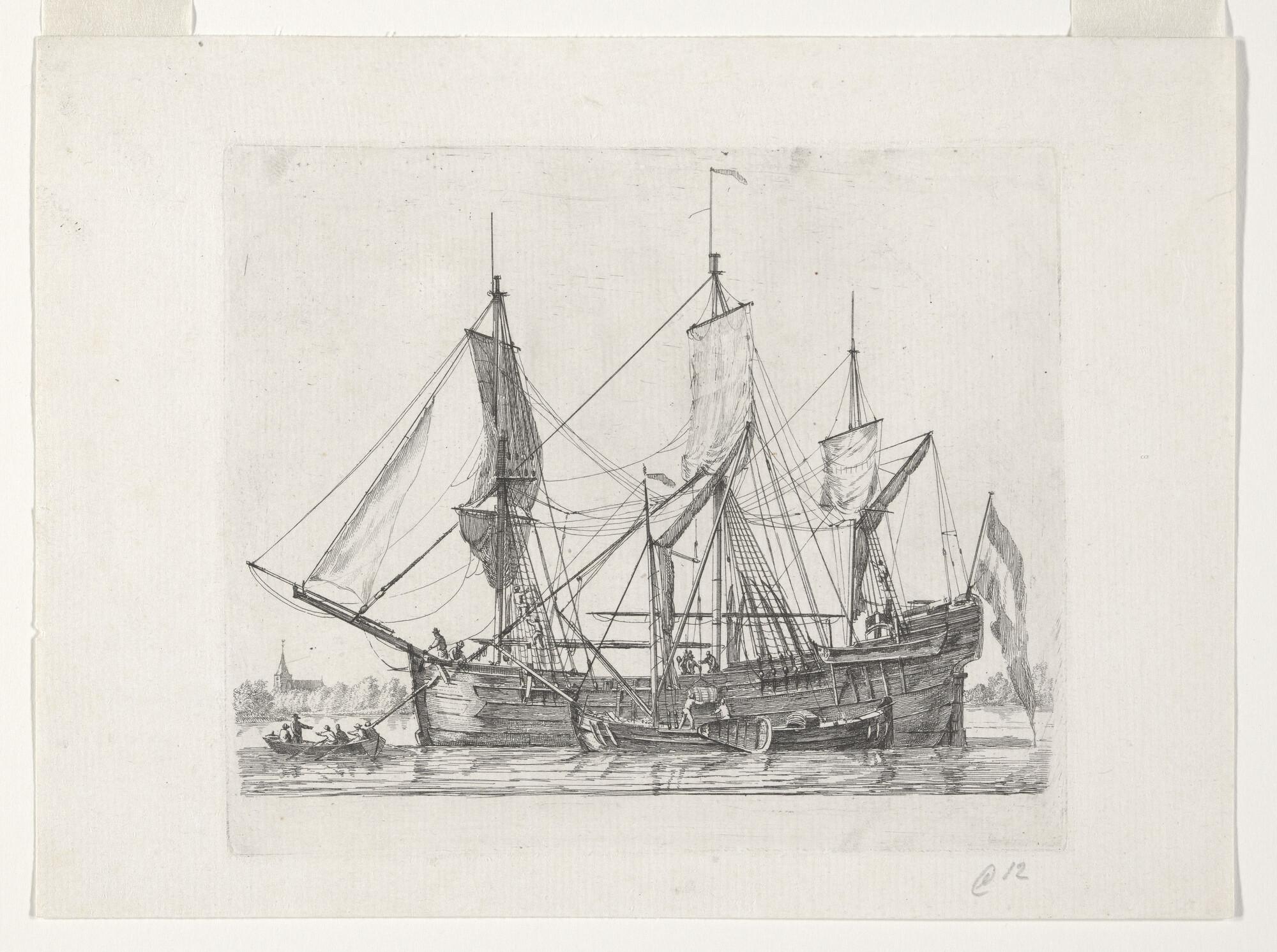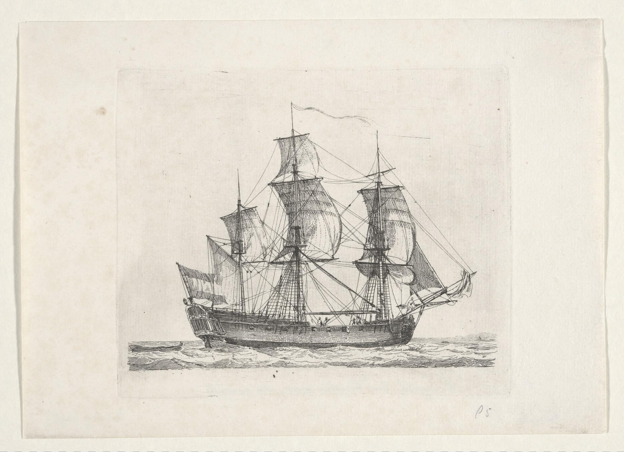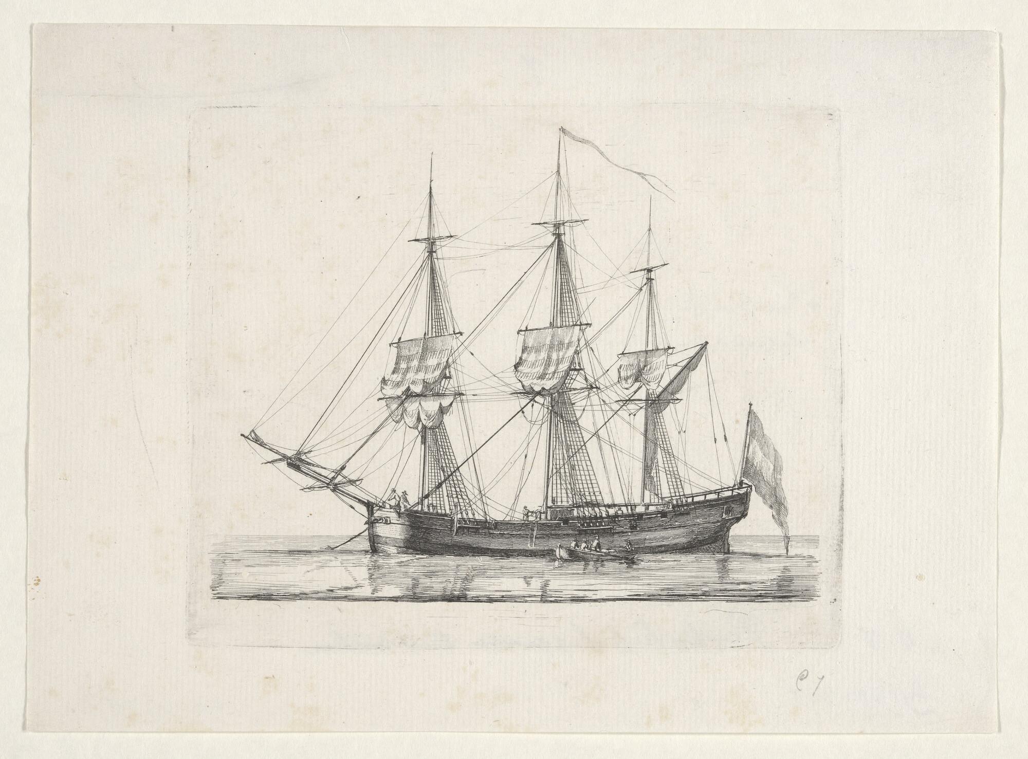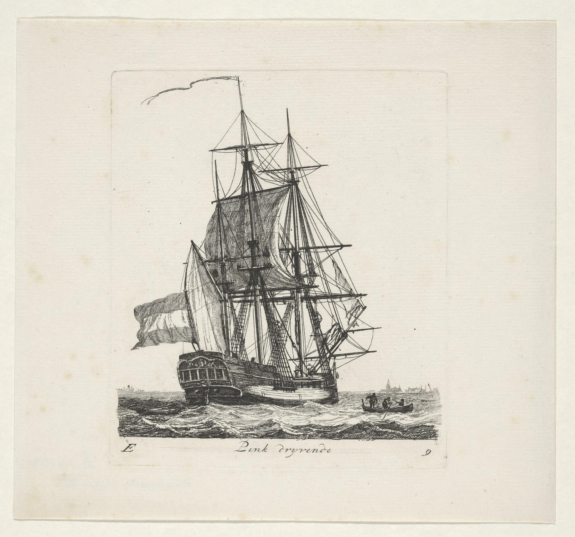 Prent van een pinkschip voor anker