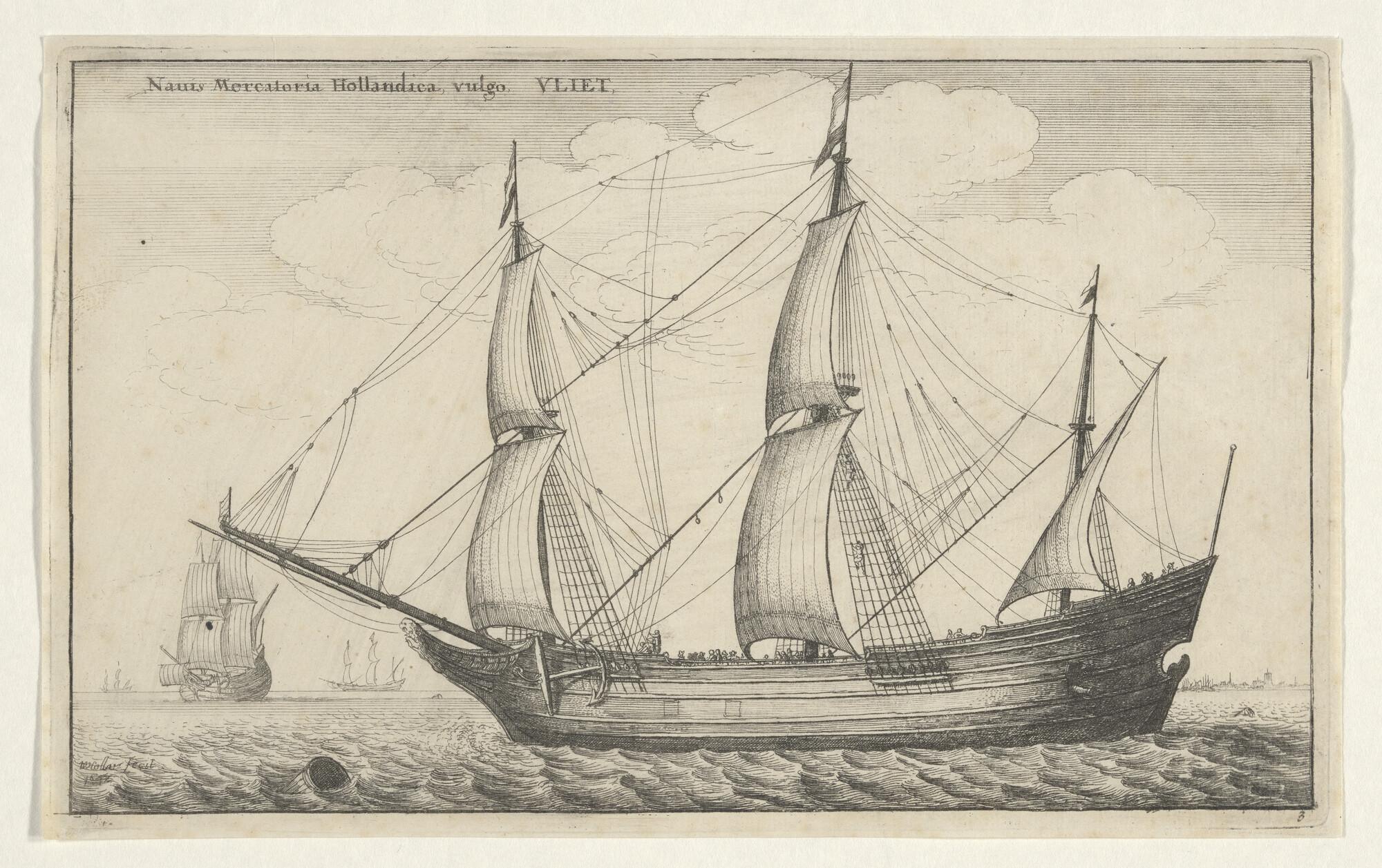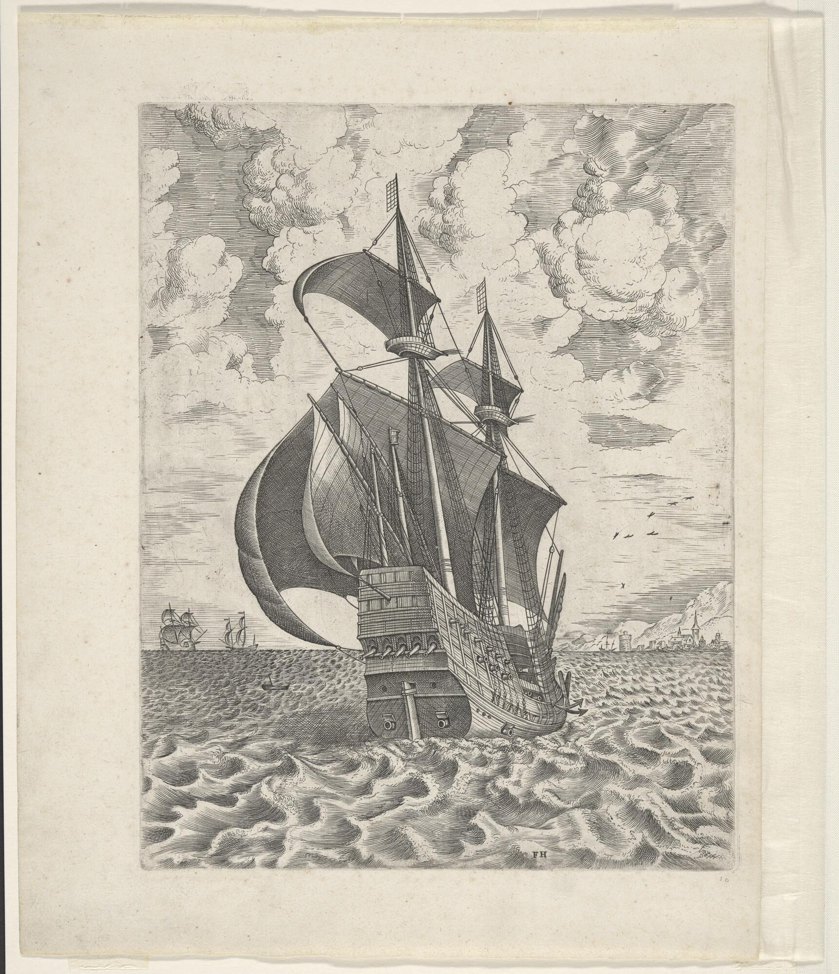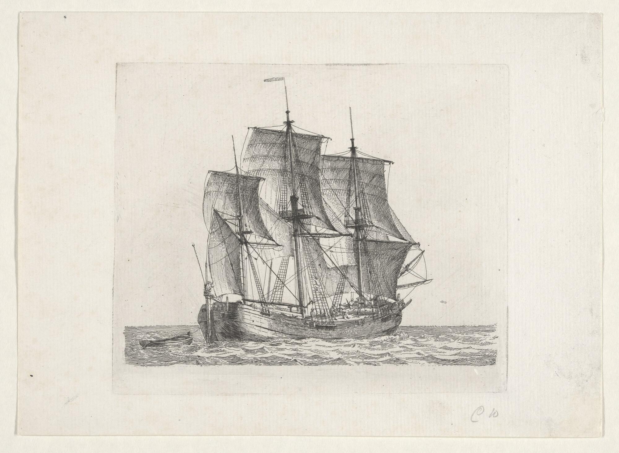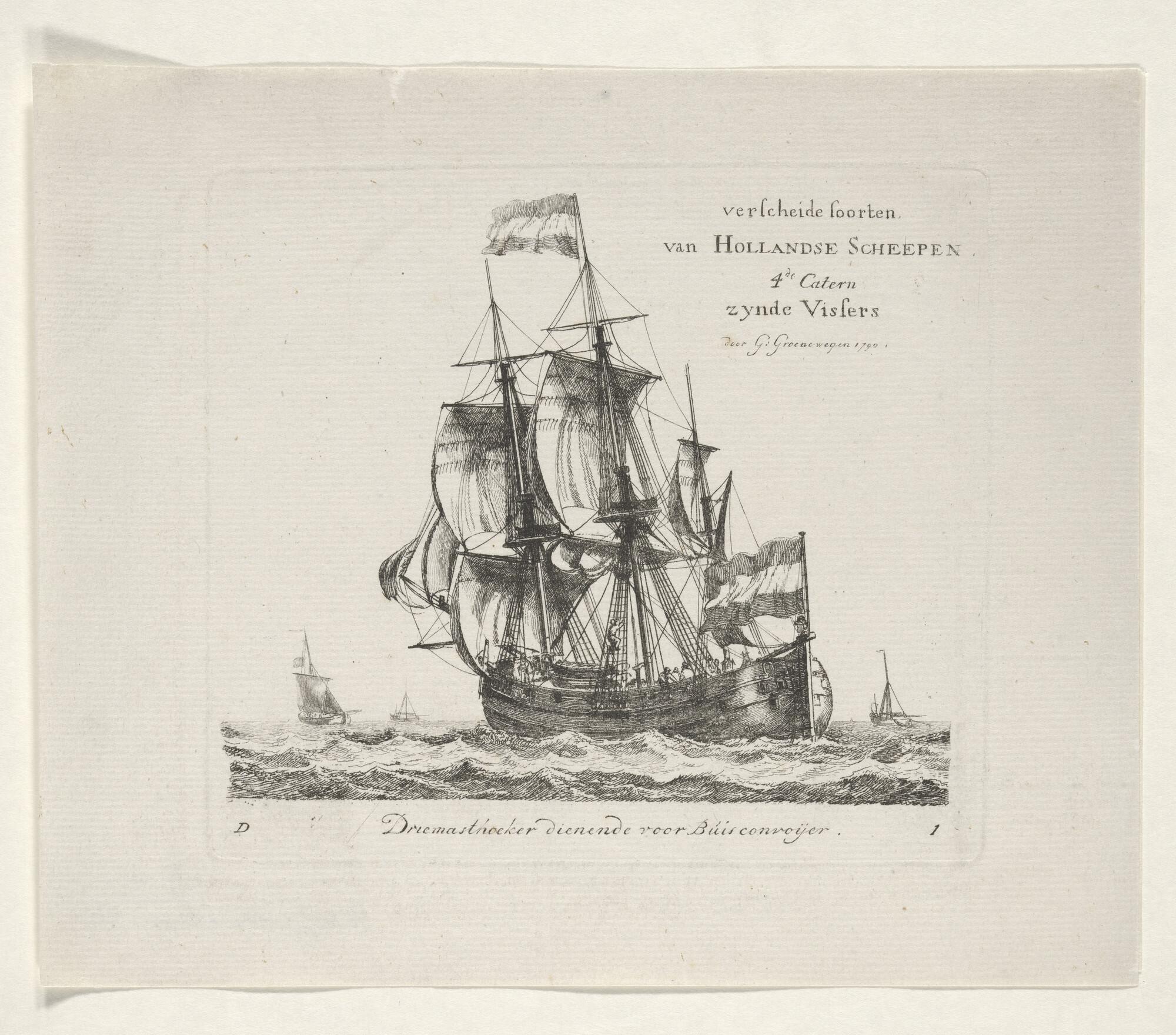 Prent van een driemast-hoekerschip