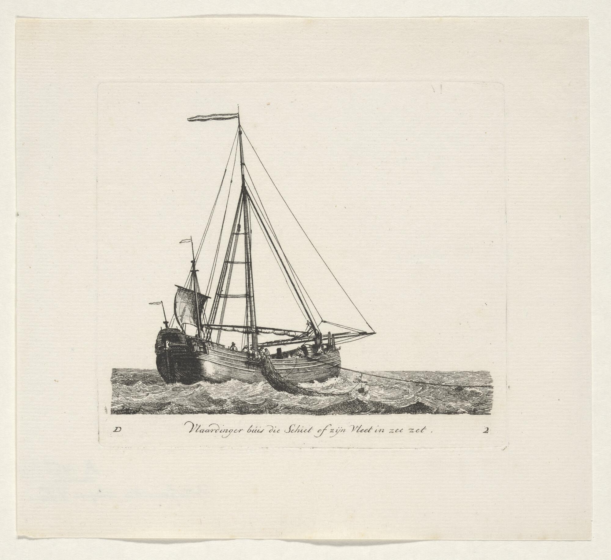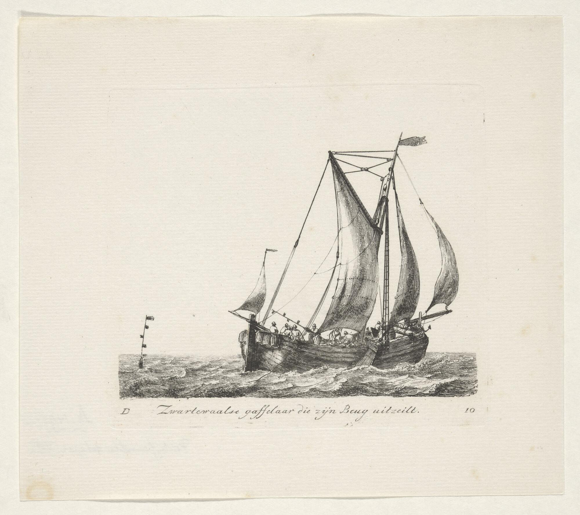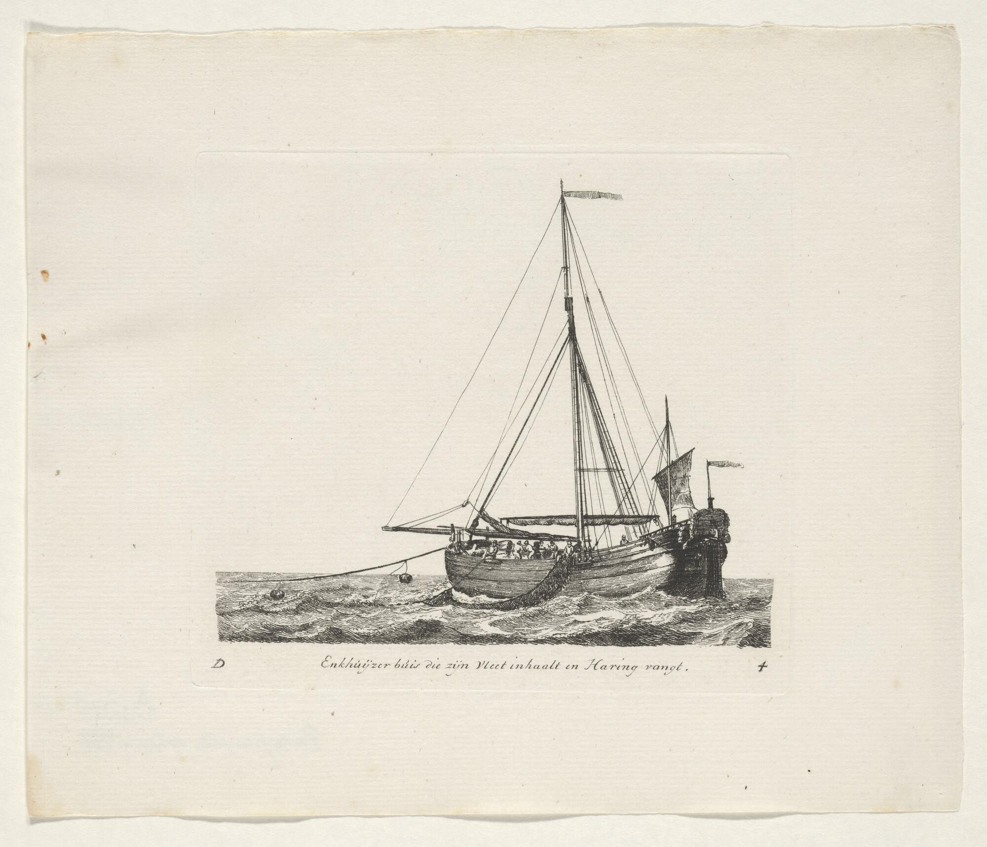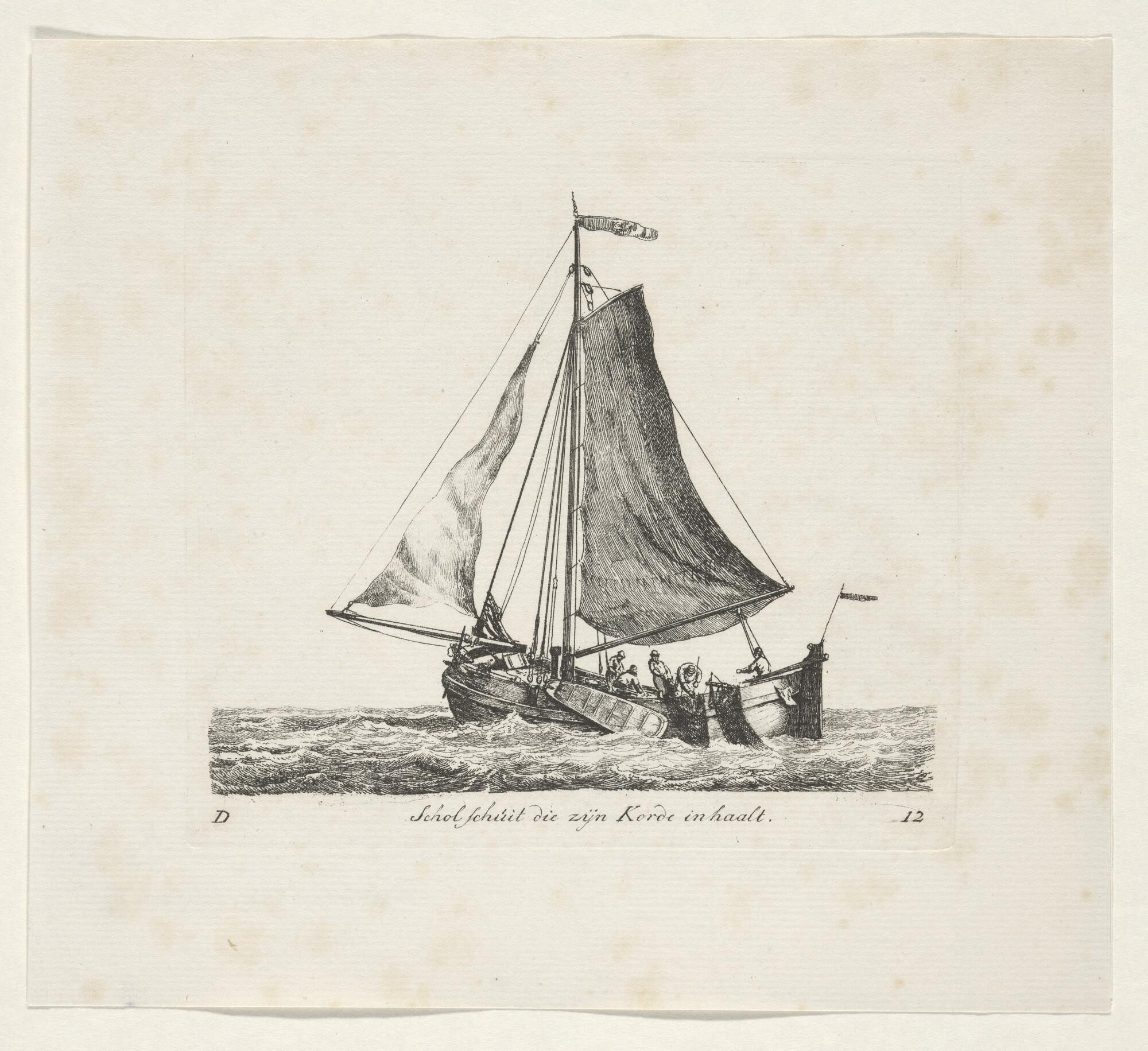 Prent van een scholschuit die zijn kor uitzeilt