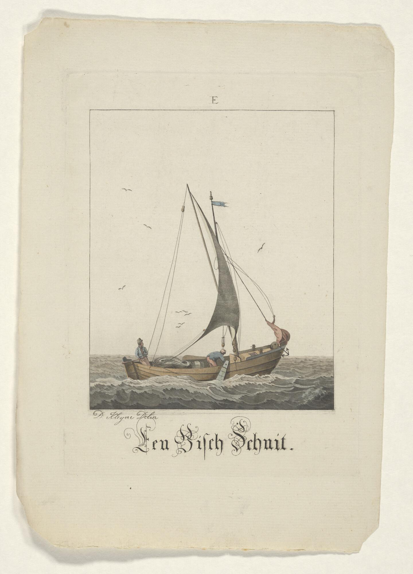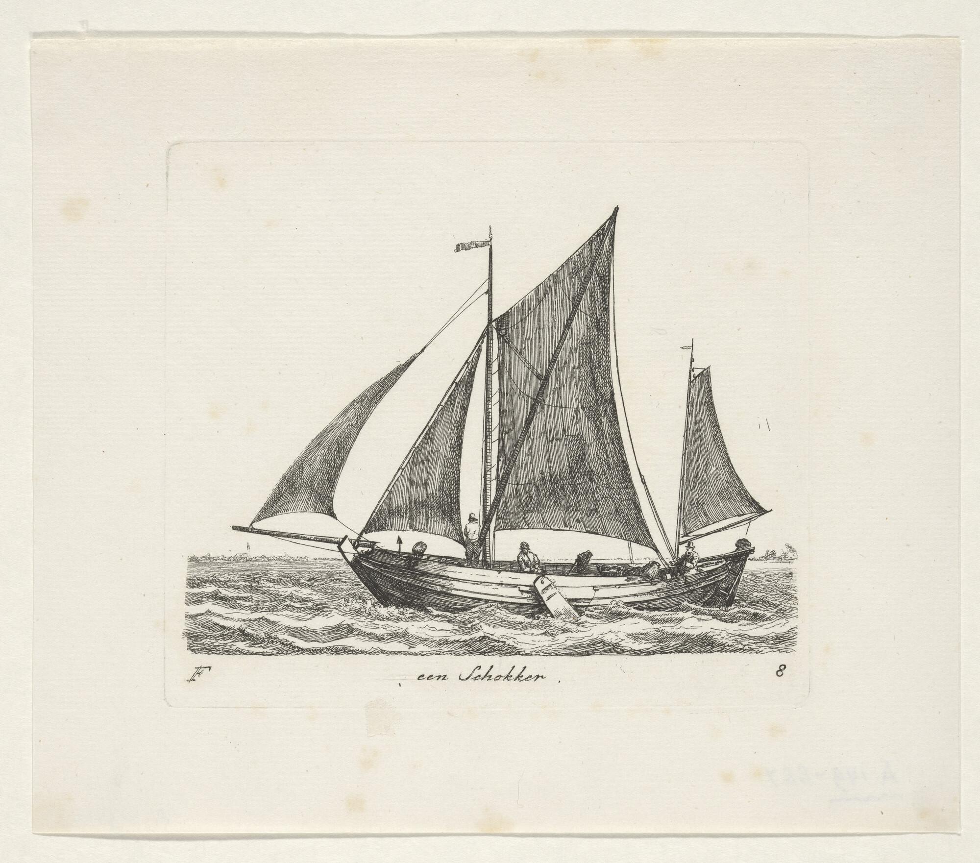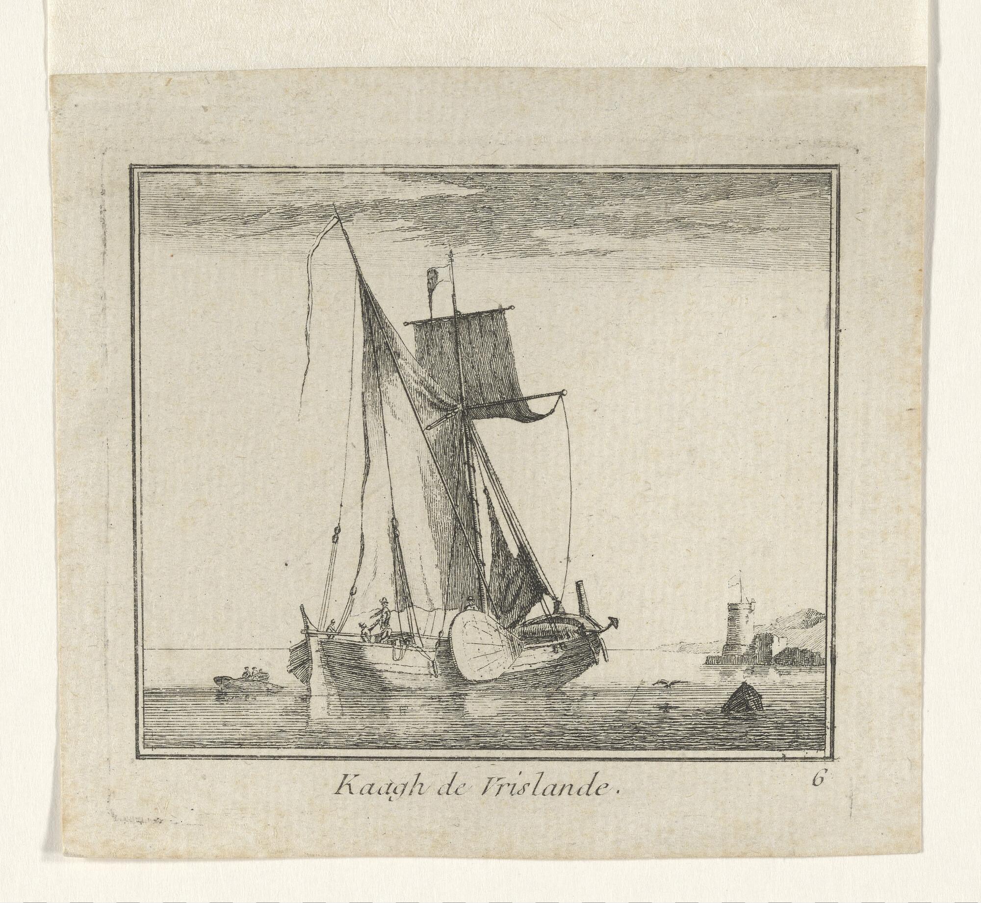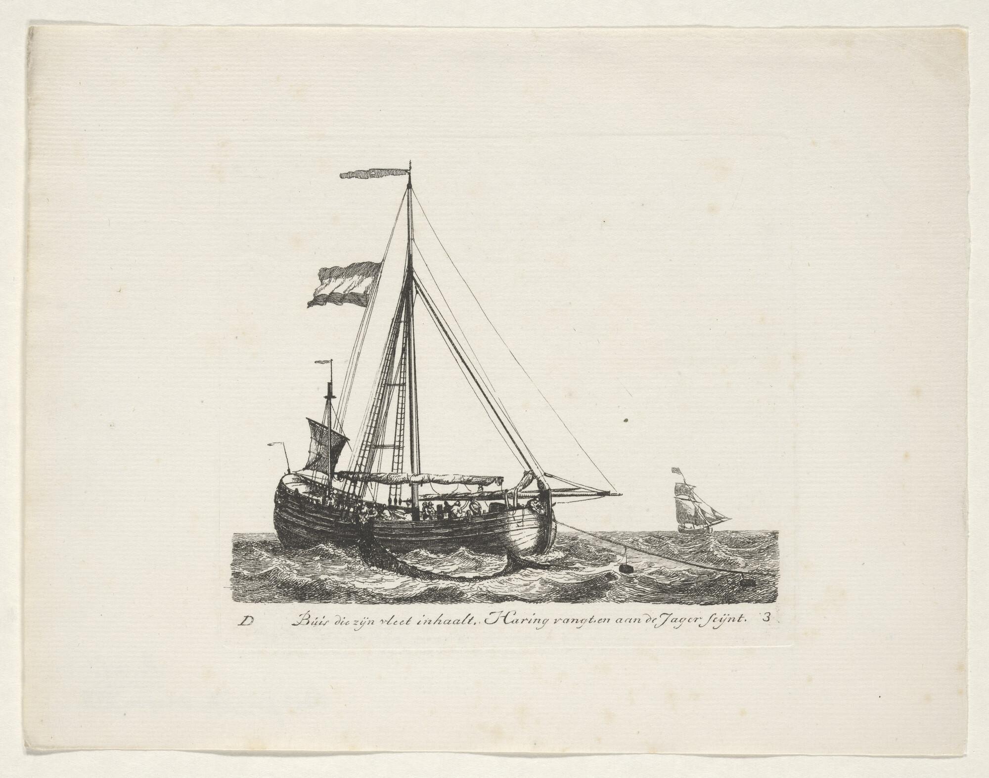 Prent van een scholschuit die zijn kor uitzeilt