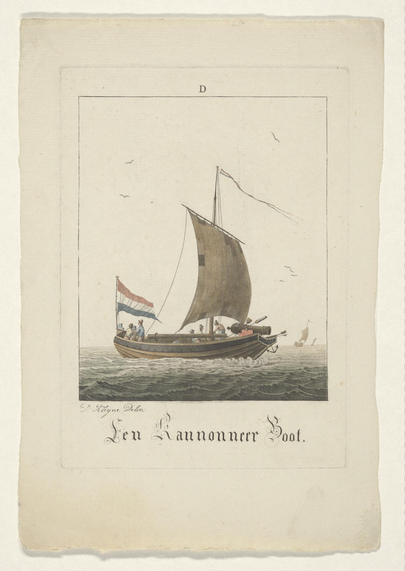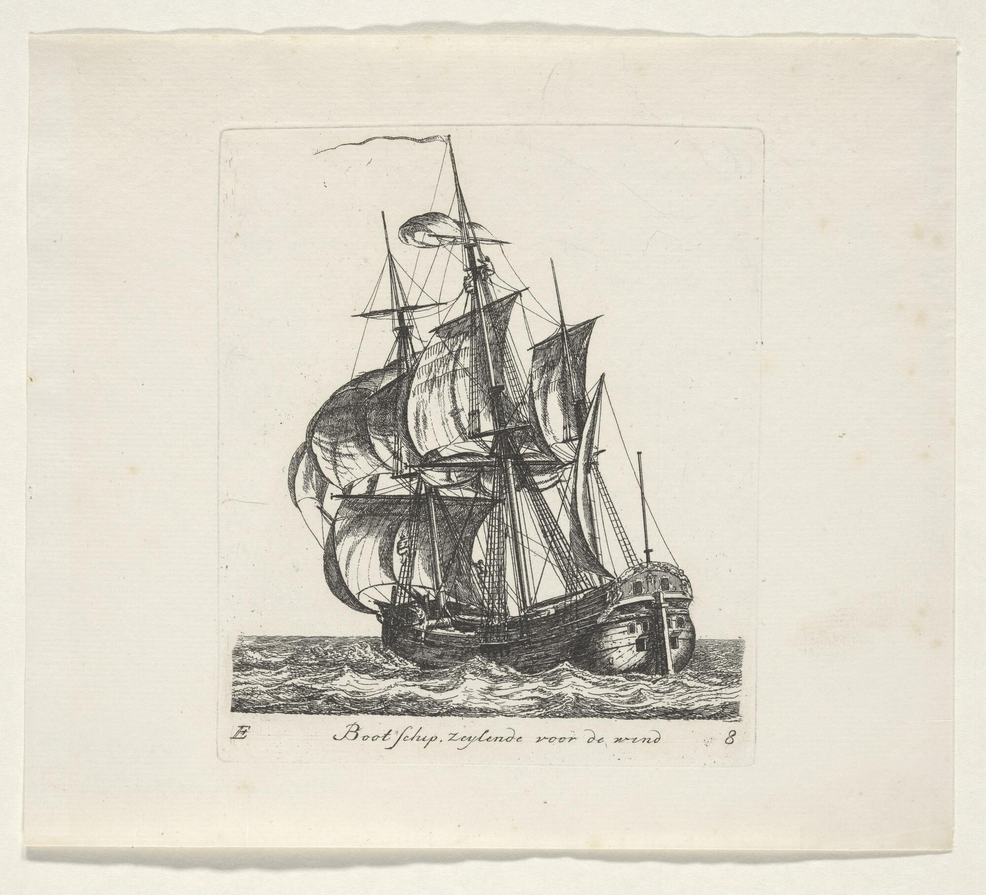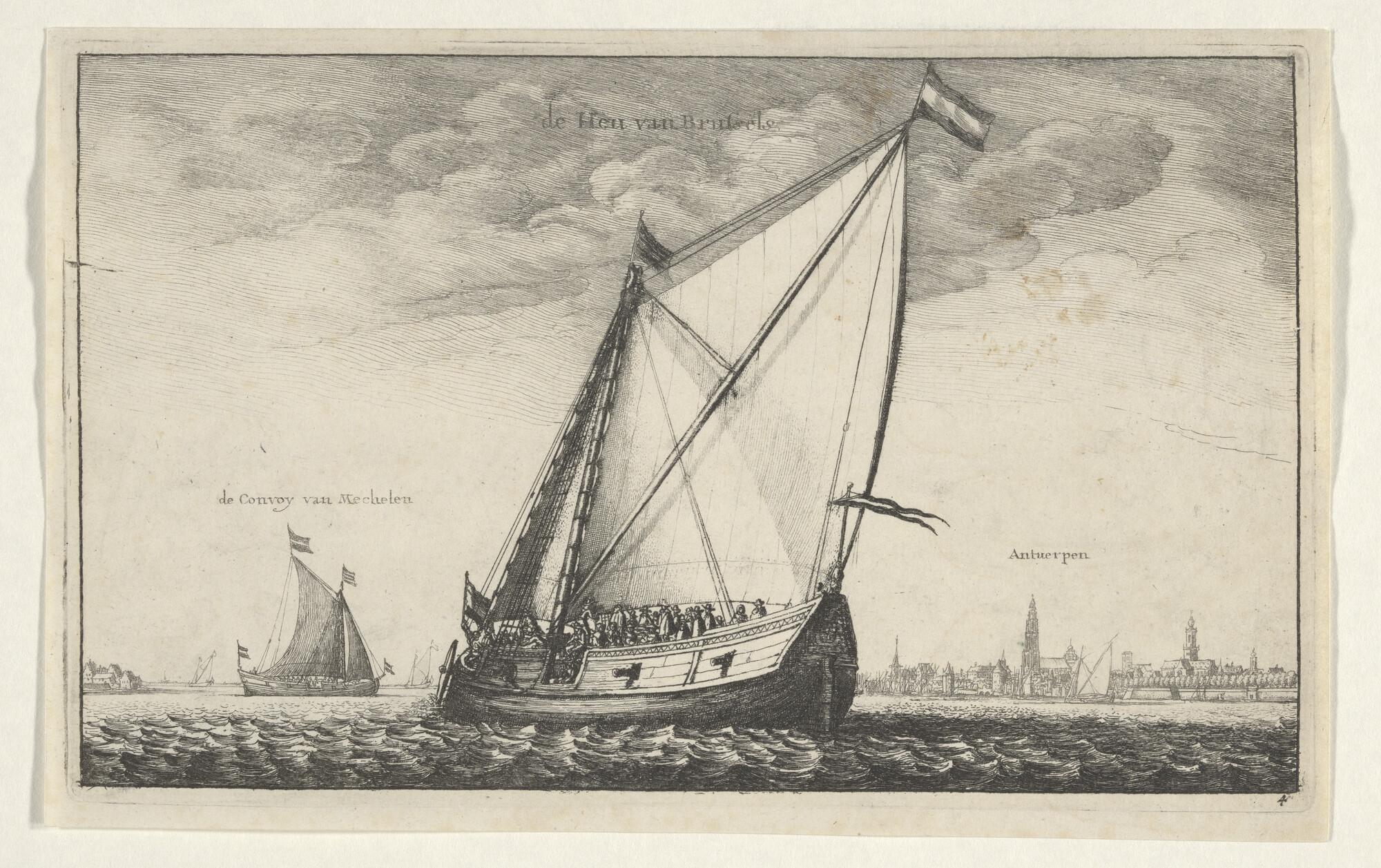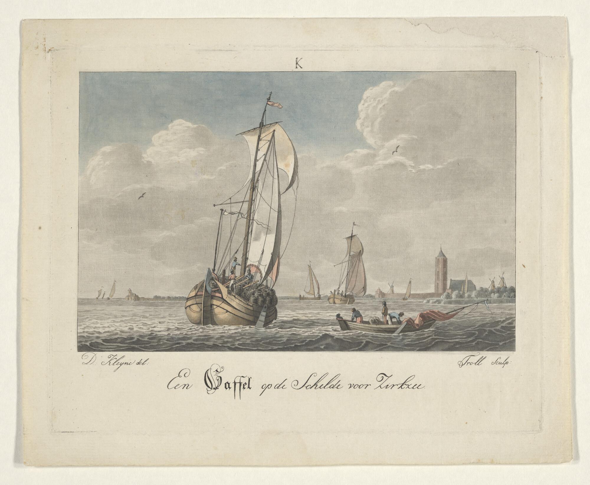 Prent van een scholschuit die zijn kor uitzeilt