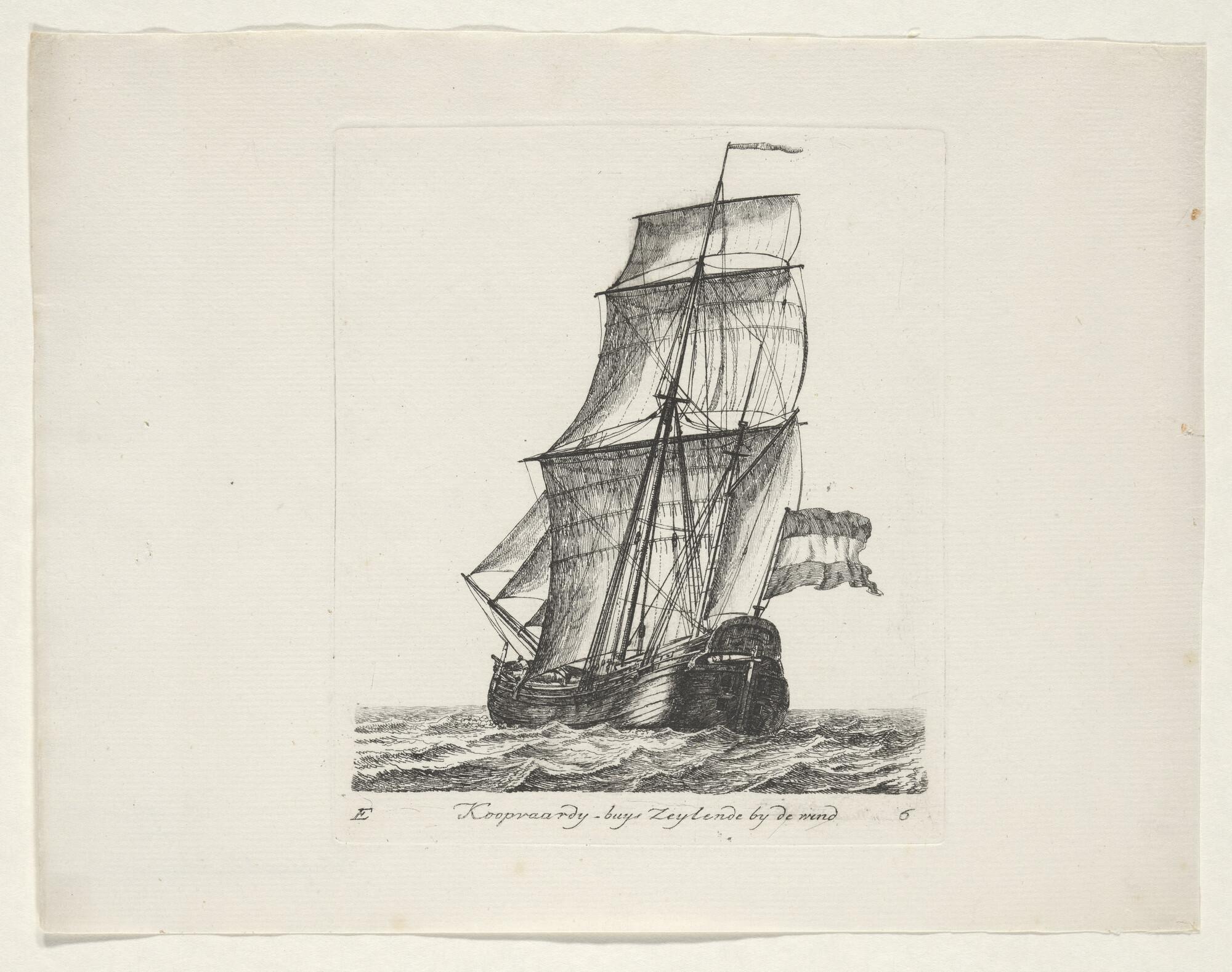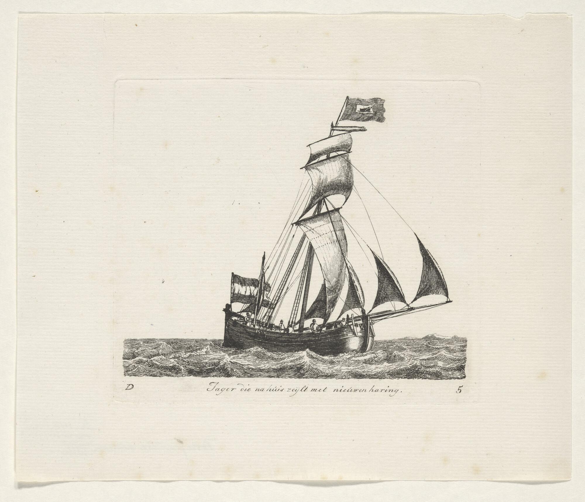 Prent van een haringjager voor de wind zeilend