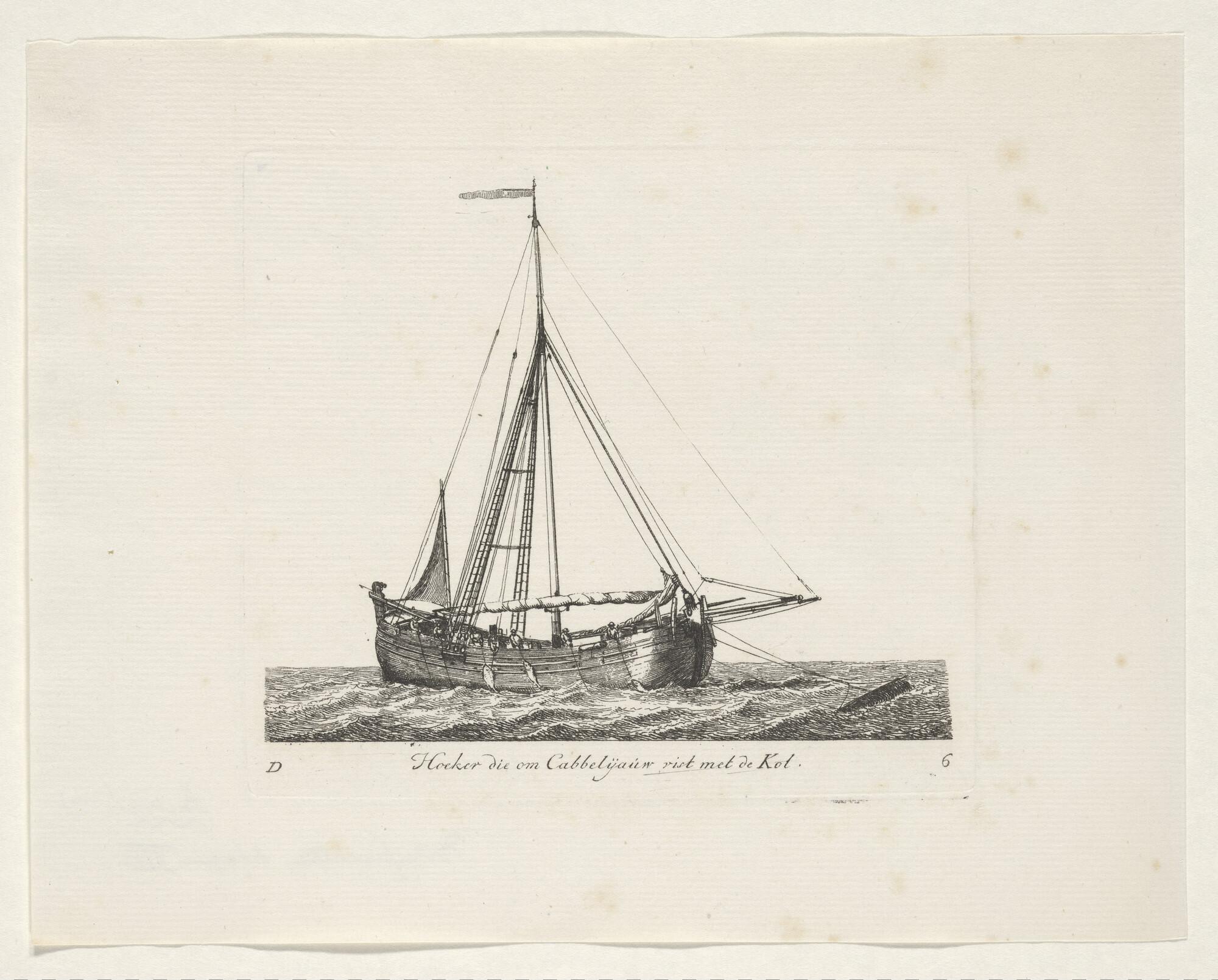 Prent van een hoeker die kabeljauw vangt met de kol