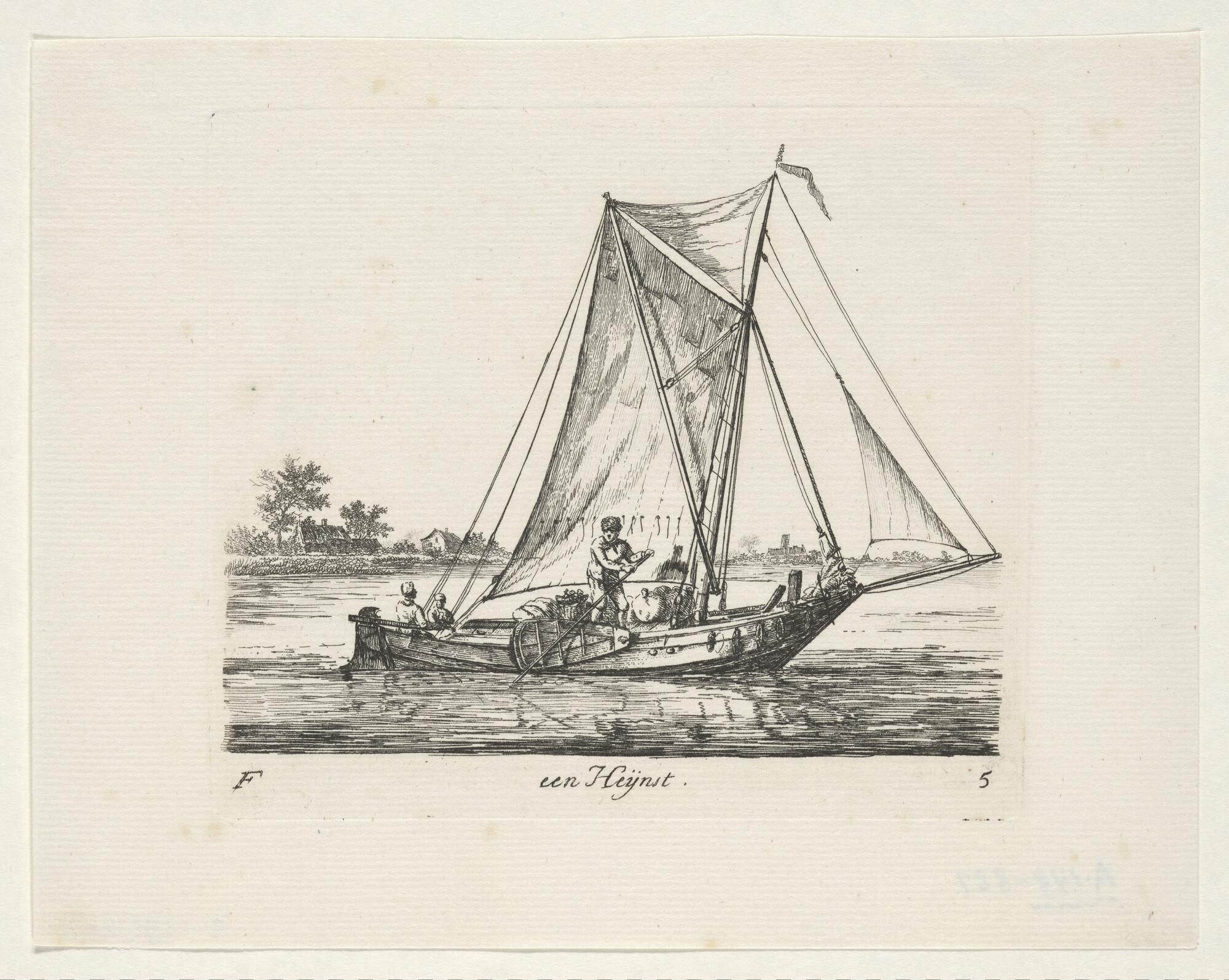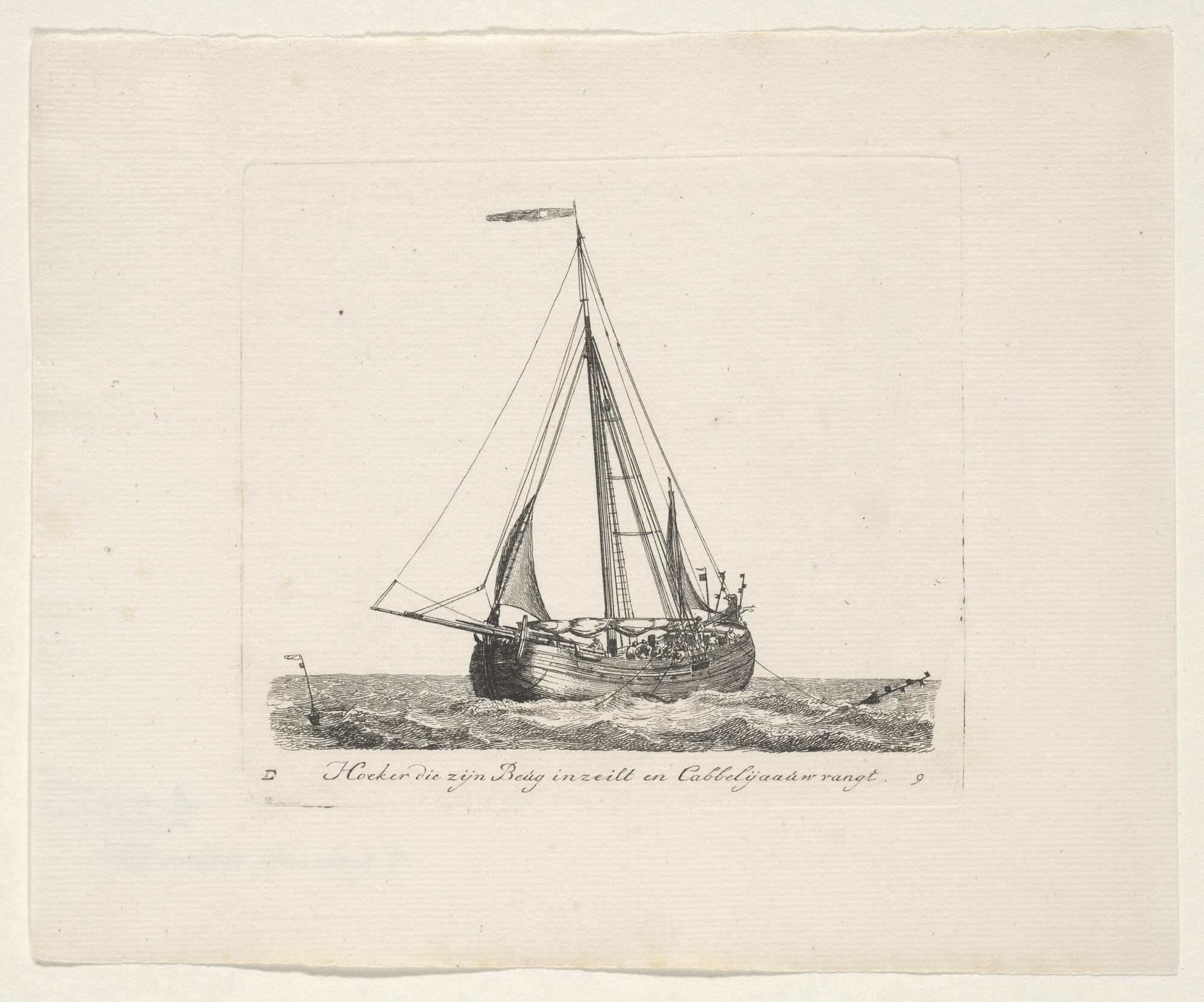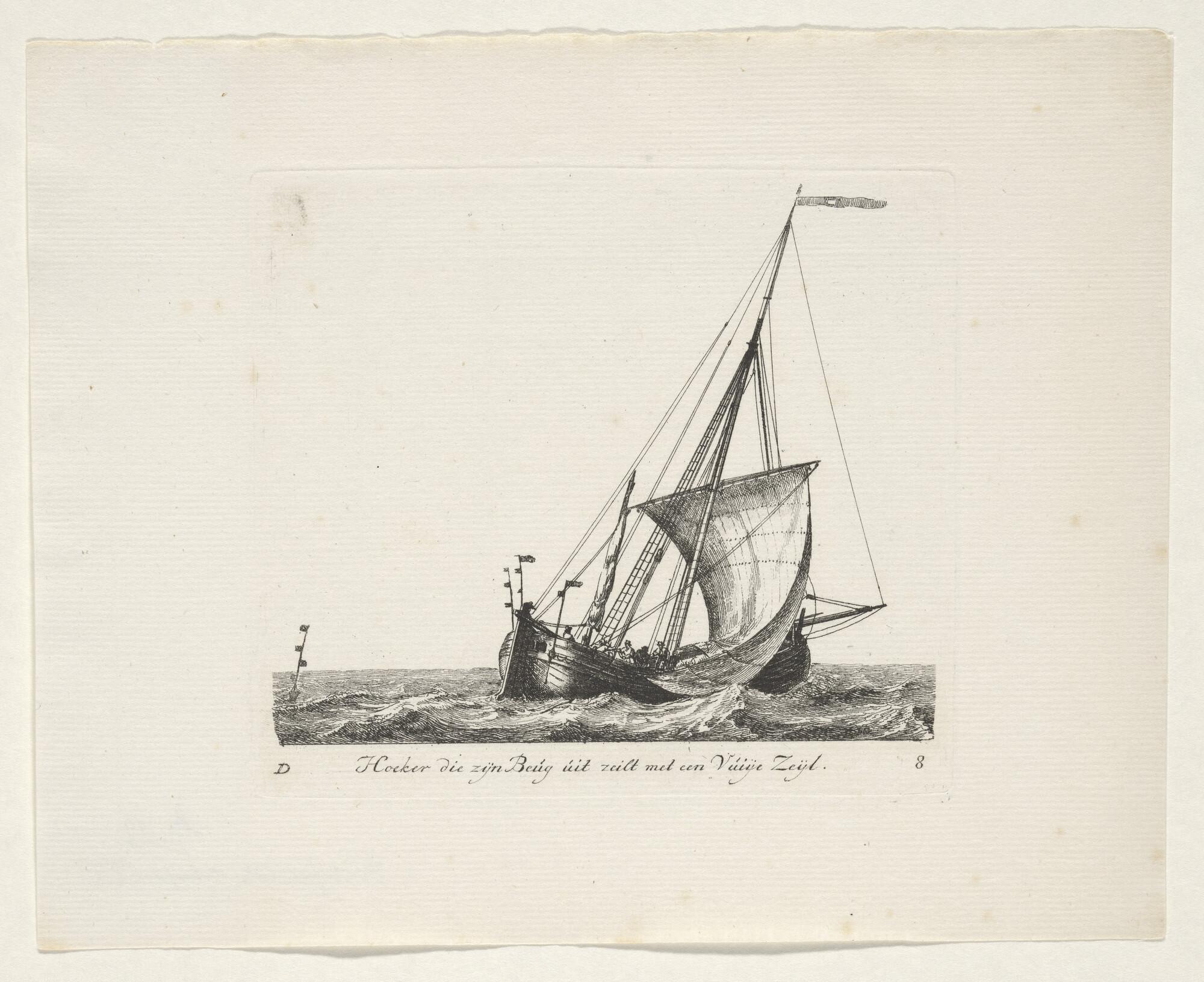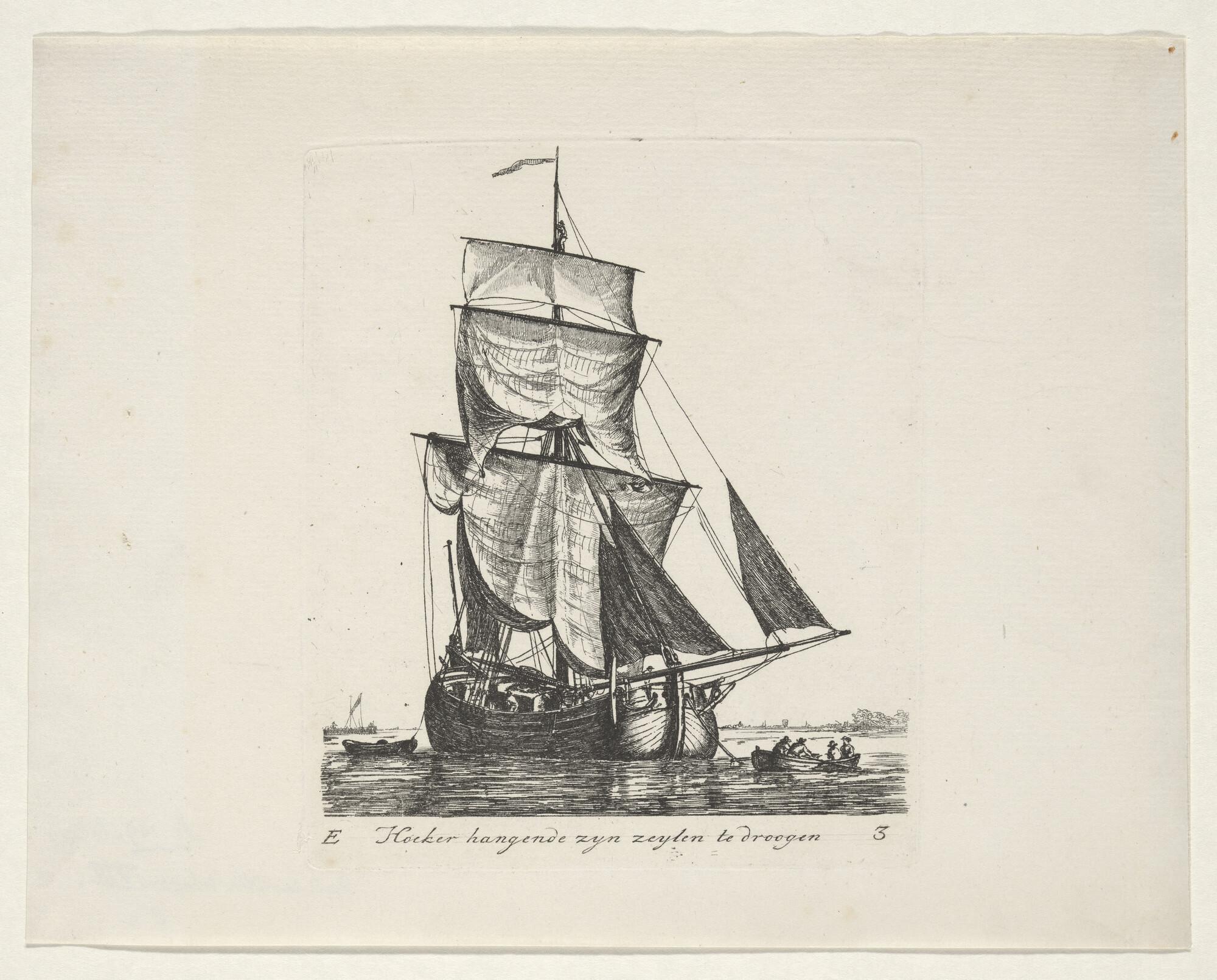Prent van een hoeker, waarvan de zeilen te drogen ha...