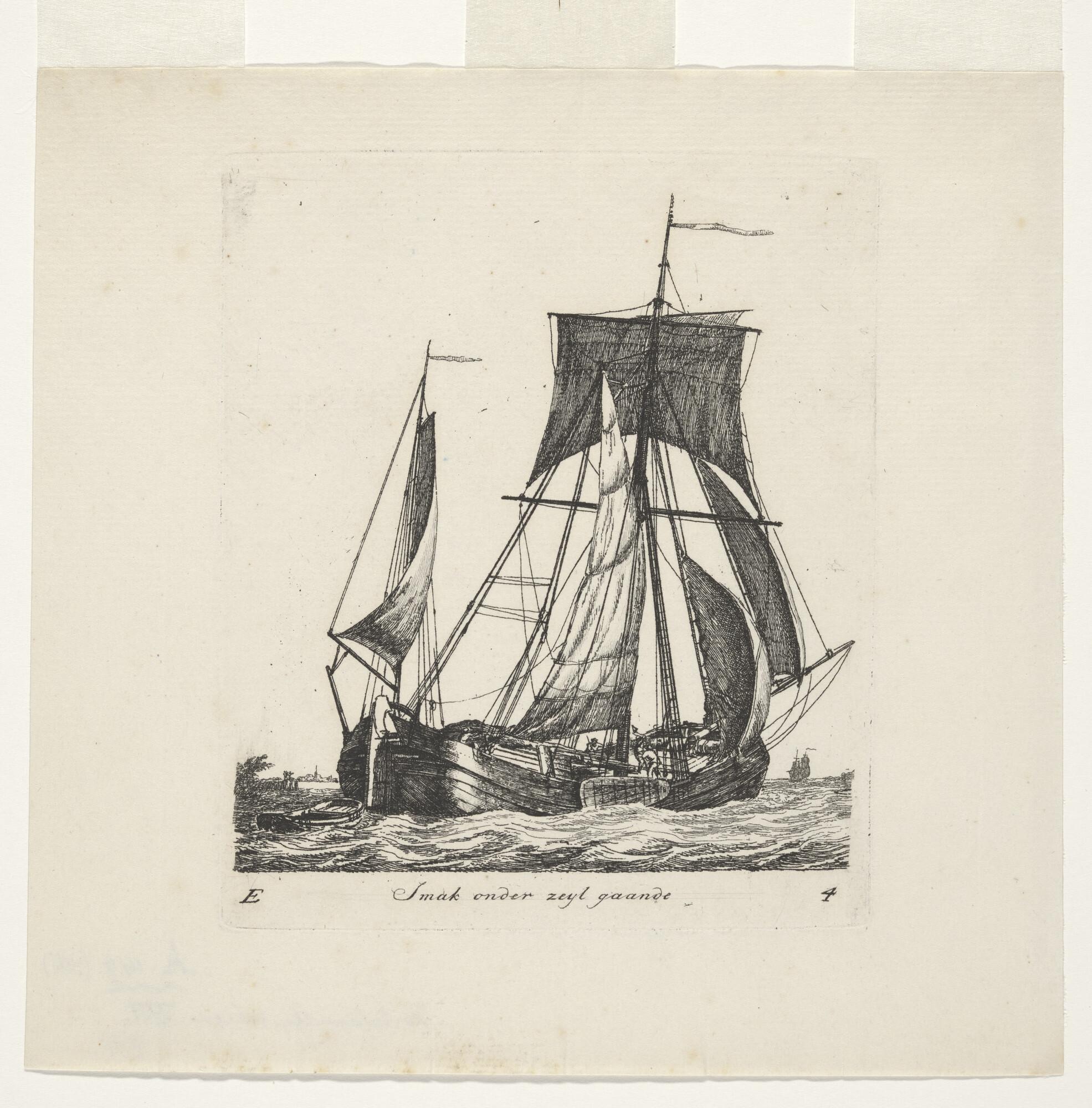 Prent van een smakschip dat onder zeil gaat