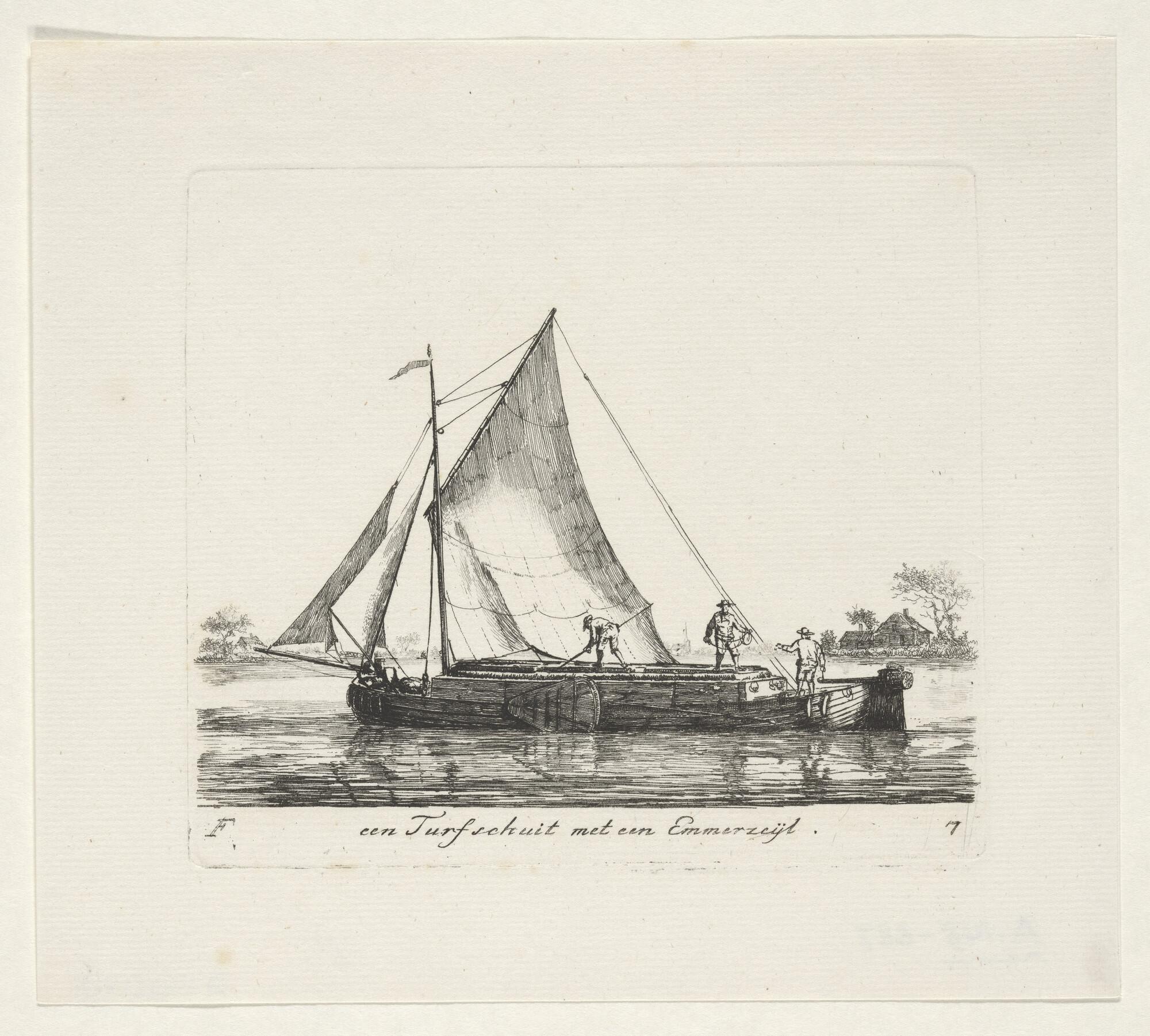 Prent van een turfschuit met een emmerzeil