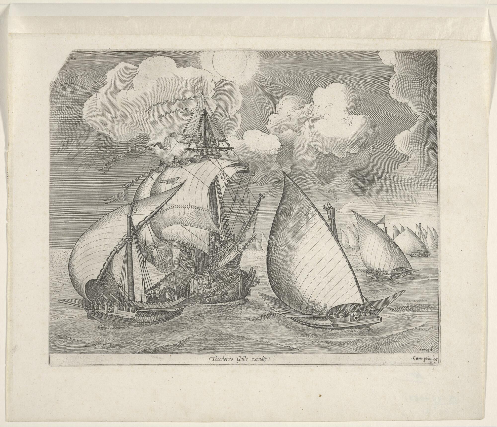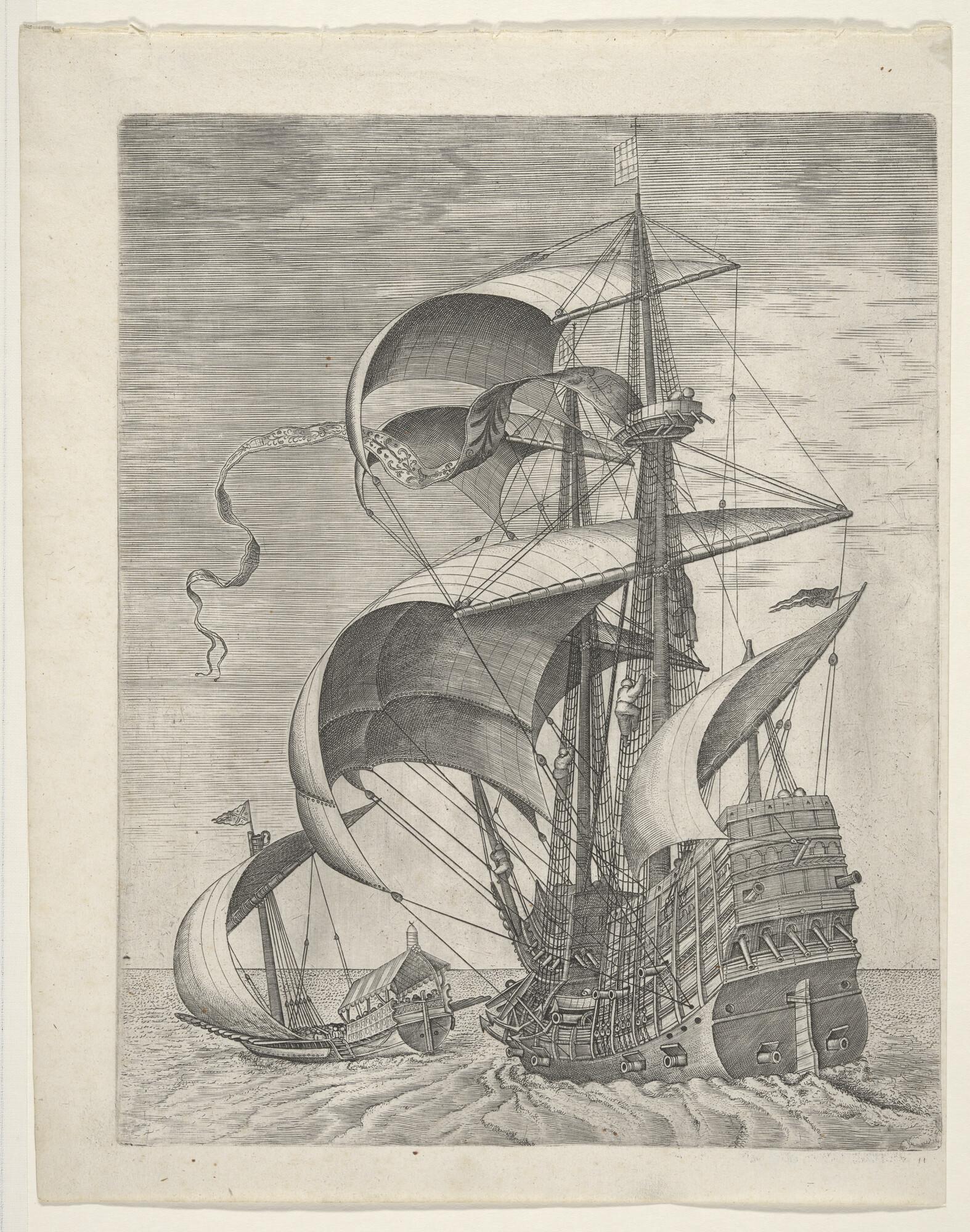Prent van een driemast-galjootschip