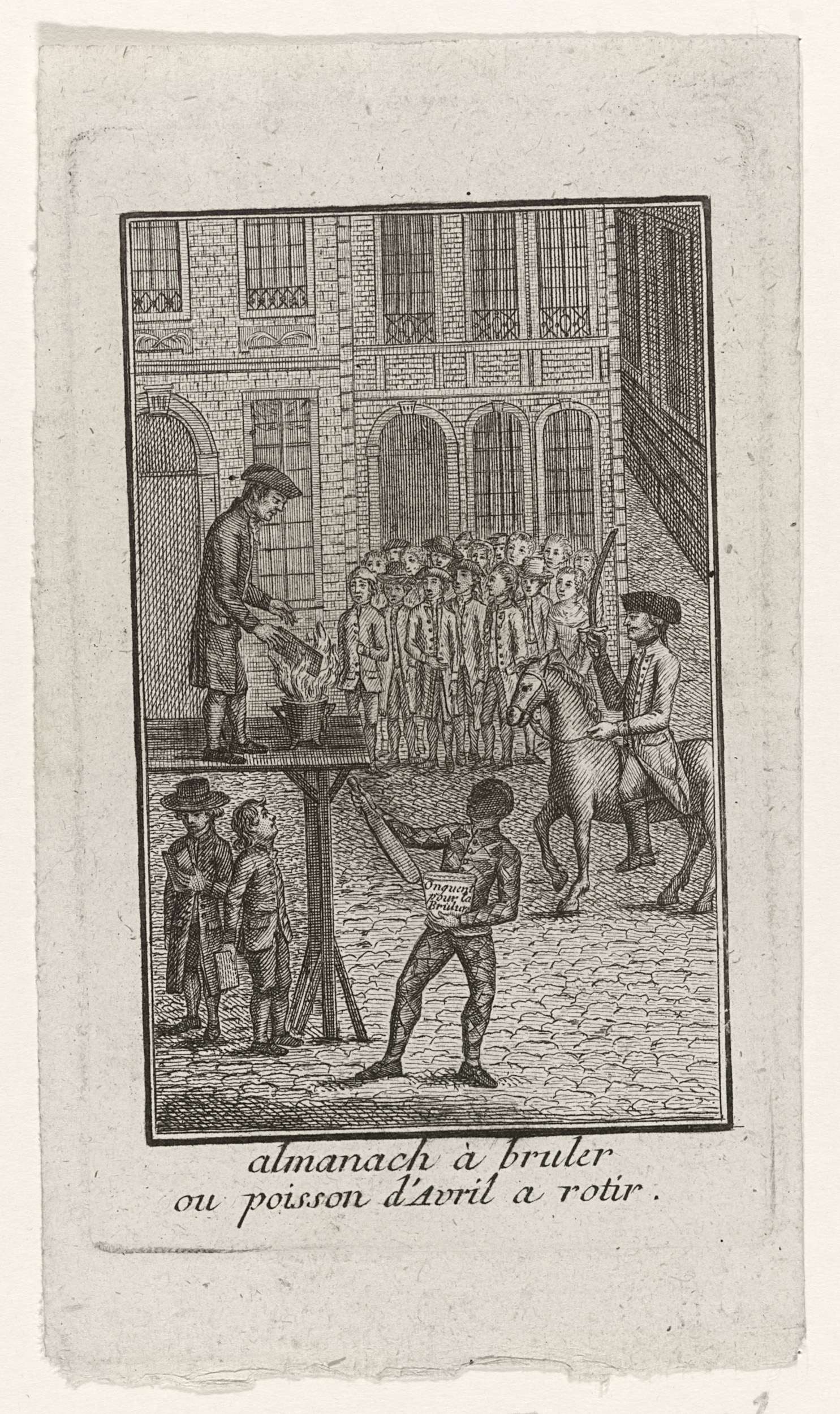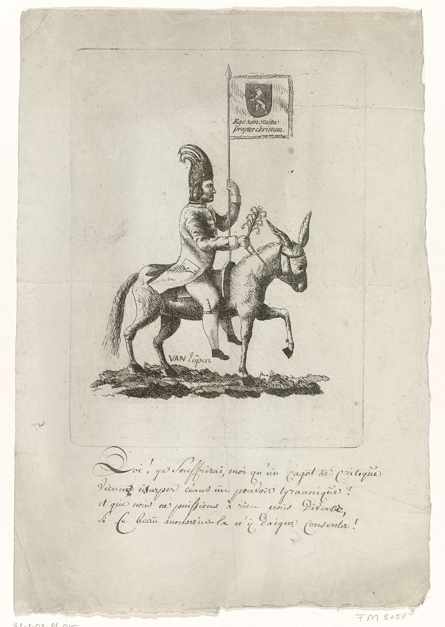 Nar met vaandel op een ezel