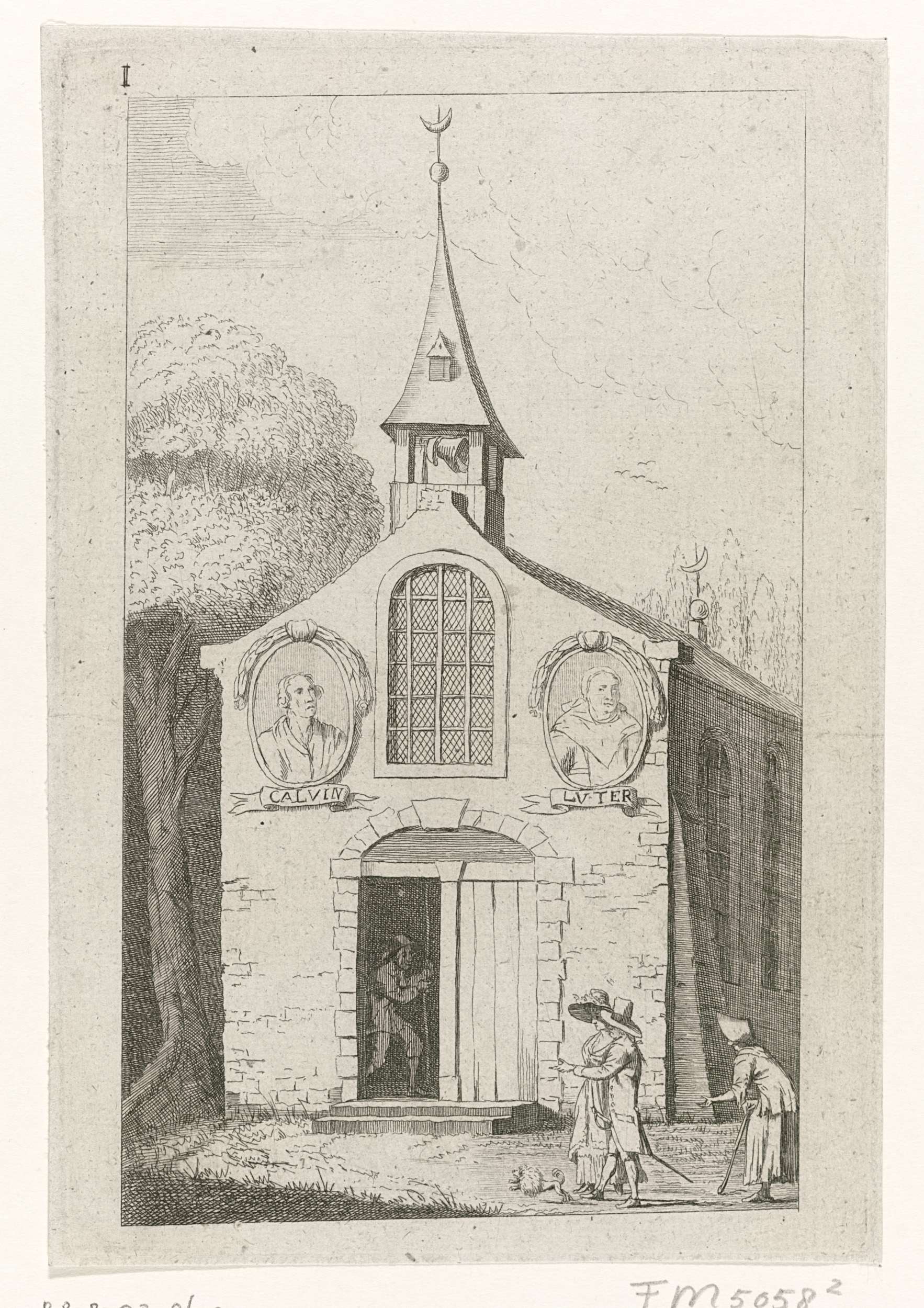 Kerk met portretten van Calvijn en Luther