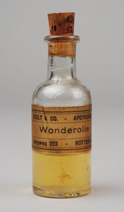 Kleine medicijnfles voor "WONDEROLIE" met kurk en et...