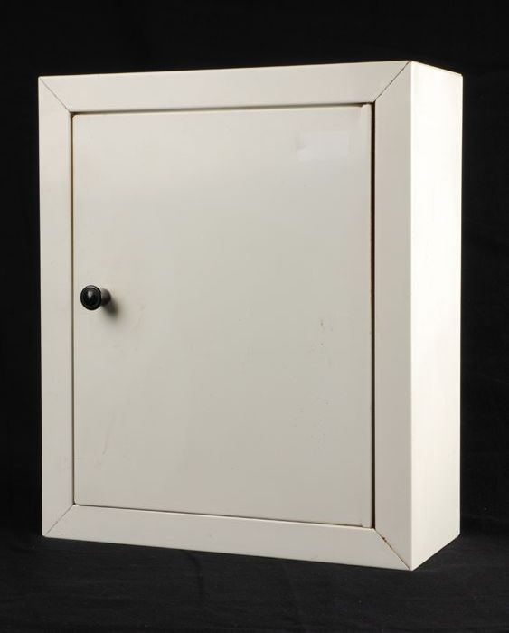 Witte, metalen medicijnkast met één legplank