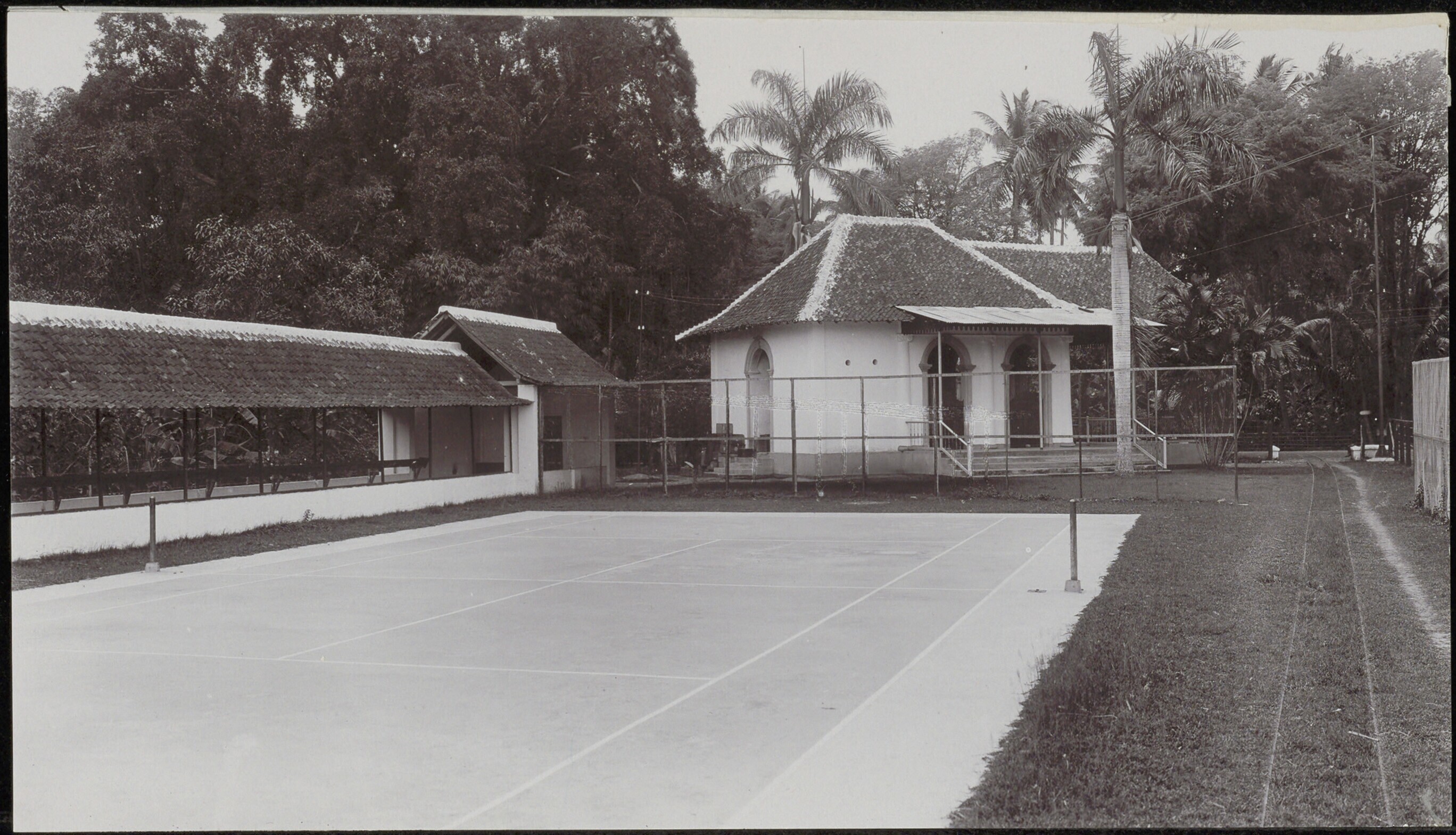 Tennisbaan met bebouwing