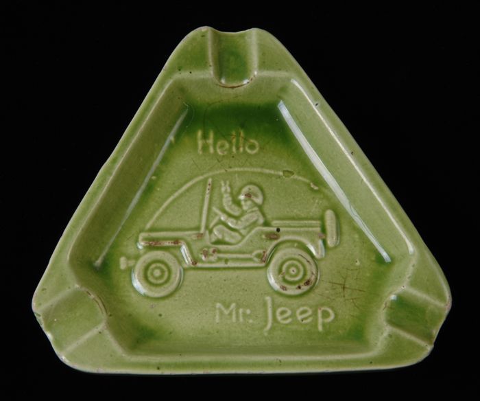 Driehoekige lichtgroene asbak met Jeep in profiel en...
