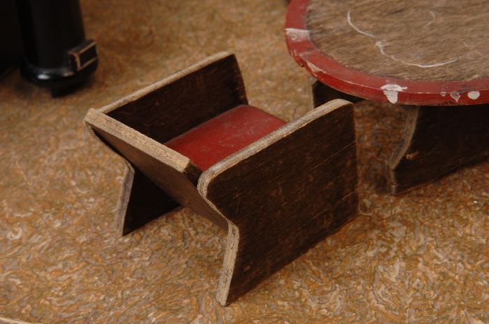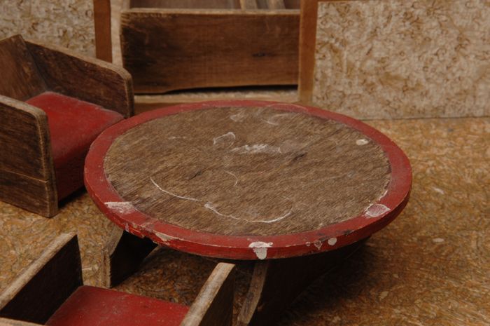 Houten miniatuur fauteuil met rood geverfde zitting ...