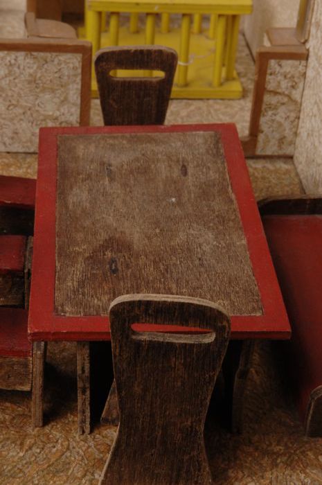 Houten miniatuur eettafel met rode rand voor woonkam...