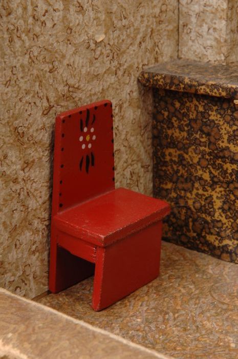 Rood geverfde houten miniatuur stoel met bloemdecora...
