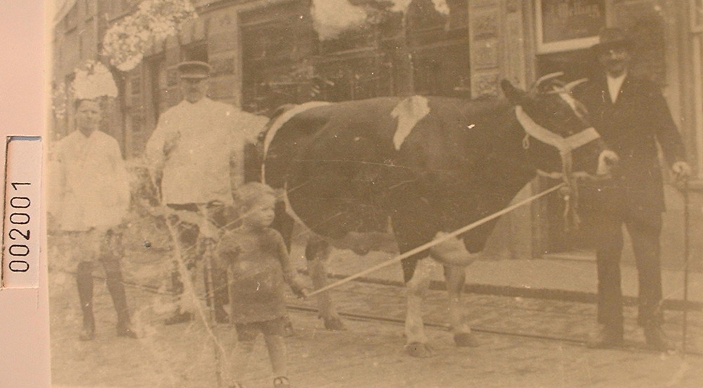 Slager Jeurissen bij de slagerij in de Vierakkerstraat
