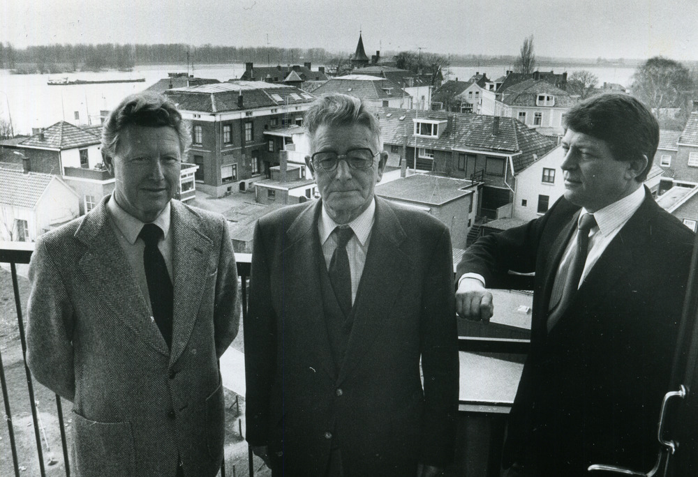 Zwart-wit foto van drie onbekende heren op een balko...