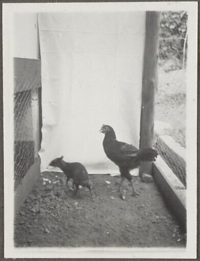 Een kantjil (dwerghert) met een kip in een kippenhok