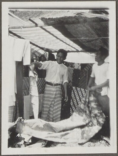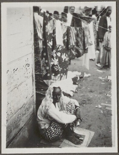 Een verkoper met doeken op de markt op de Tengkoeroe...